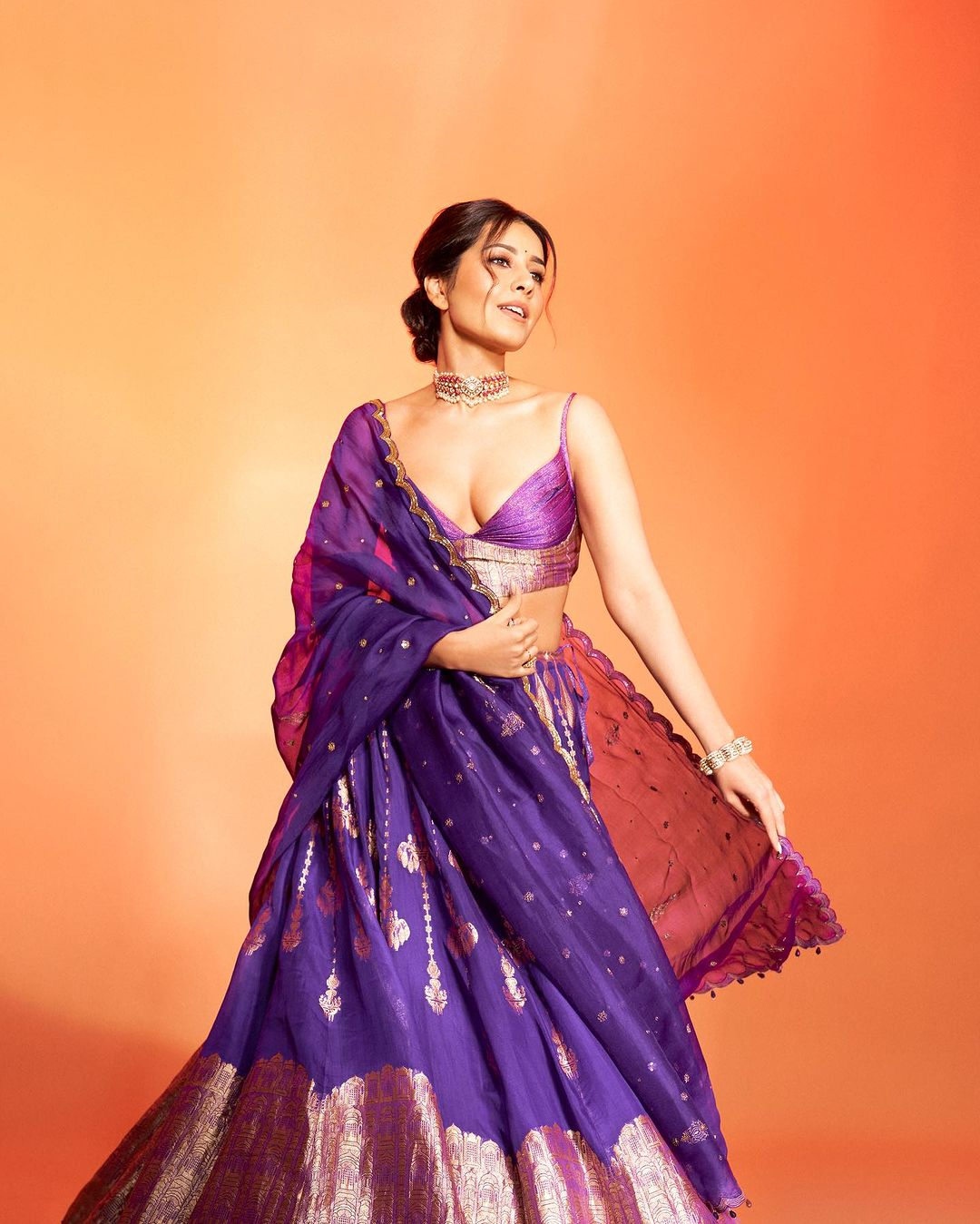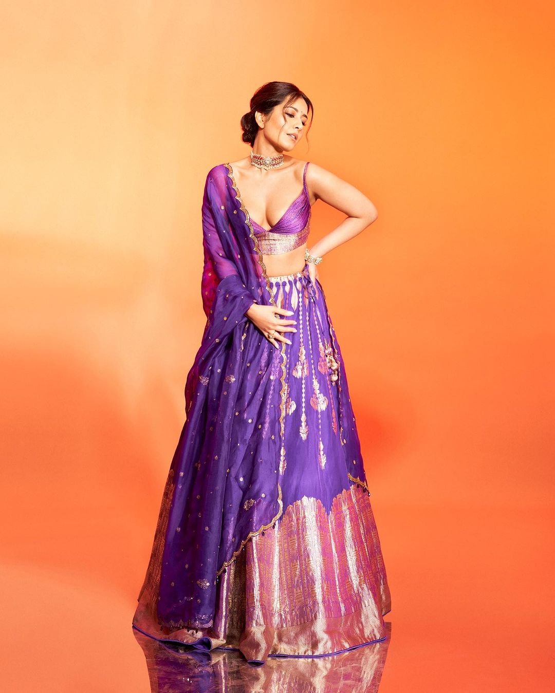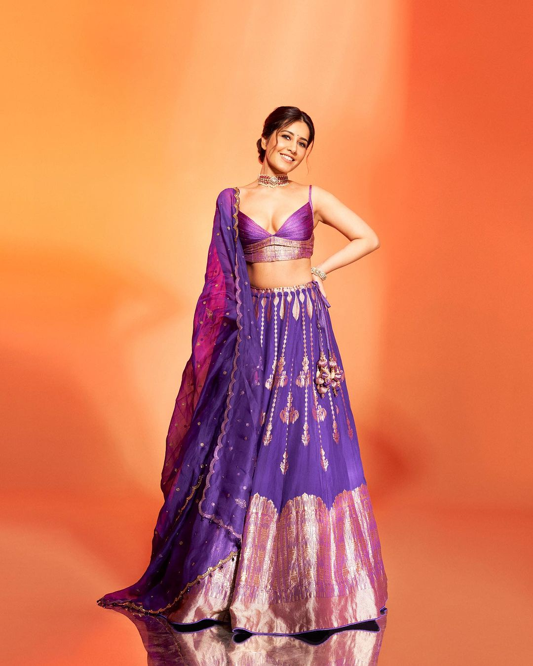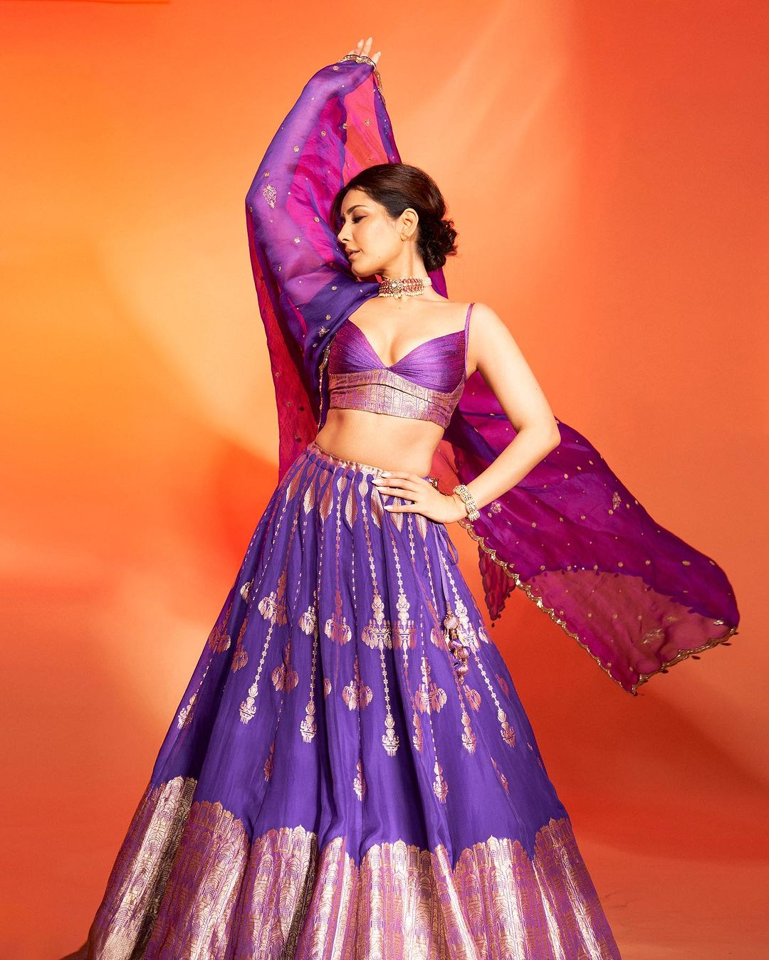 Raashii's purple lehenga choice accentuated her grace and poise and was a fantastic match for her skin tone. She looked stunning thanks to the deep-necked shirt and the elaborately carved choker necklace, which gave her an air of glitz. Her contagious grin took the stage thanks to the classic bun hairdo and the simplicity of a bindi, which accentuated her innate attractiveness. Raashii's ability to skillfully combine traditional components with modern style won her accolades from fans.
