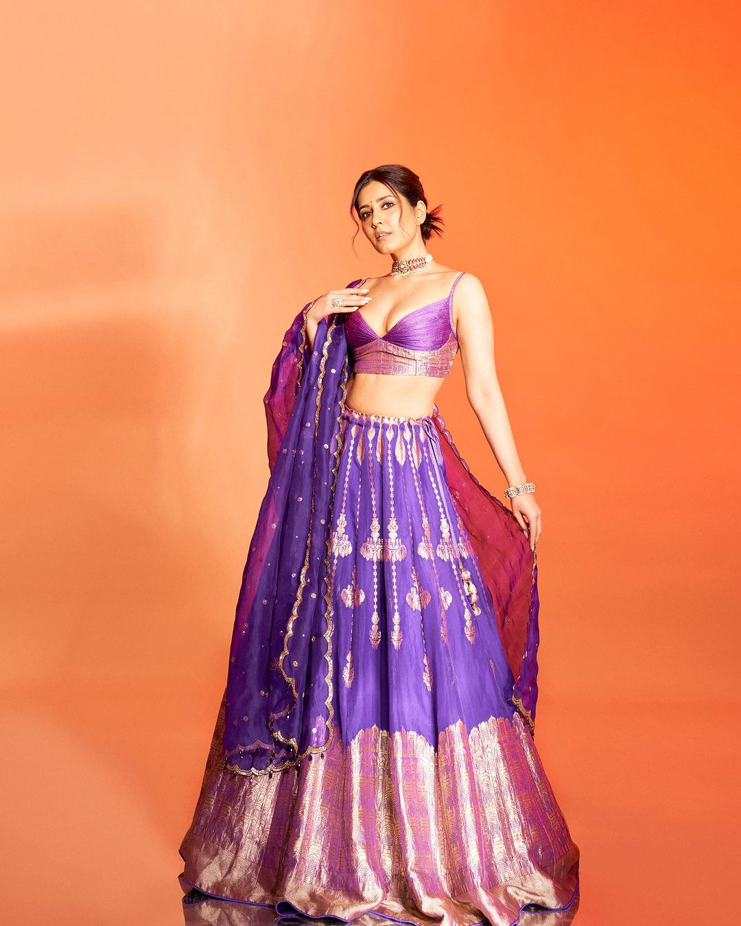 Famous for her adaptable acting in Telugu, Tamil, and malayalam films, indian actress Raashii Khanna recently shared an amazing photo of her newest ethnic costume on Instagram. The 32-year-old beauty shared a photo of herself wearing a deep-necked blouse, a choker necklace, a simple bindi, and her hair pulled back into a tidy bun. She looked stunning in this outfit.