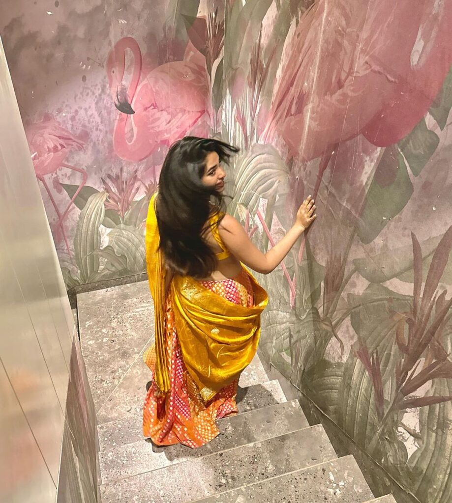 Krithi Shetty looked stunning in a silk half-saree for Navratri, matching an orange lehenga and golden jewellery-adorned dupatta with a yellow top. Her appeal is further enhanced by her traditional attire, which she wears with confidence to highlight her stomach in this alluring image.