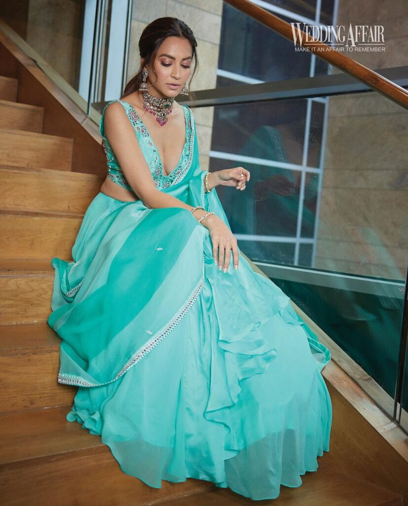 Her passionate fan following gathers on Instagram, where she often posts insights into her life. She looked stunning in a striking blue outfit that had a low-neck embroidered top combined with a lehenga and dupatta. Today, she graced the pages of "Wedding Affair" magazine. Her striking neckline, accessorised with a statement necklace and statement earrings, accentuates her stunning features. She captivates with her overall breathtaking beauty, along with a modest yet exquisite hairstyle.