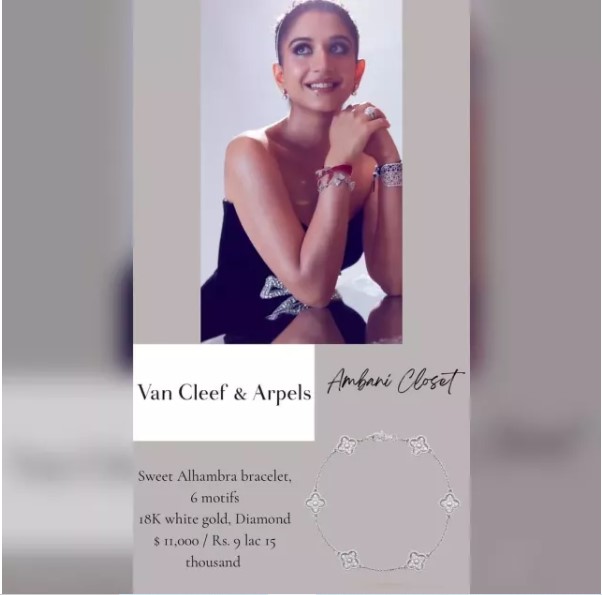 With her outfit, radhika styled an 18-carat white gold-diamond bracelet with 6 motifs from the brand 'Van Cleef & Arpels', which comes with a price tag of Rs 9 lakh 15 thousand.