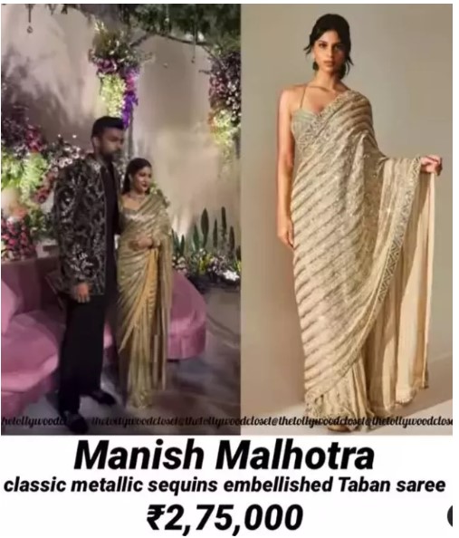 Lavanya Tripathi chose a golden saree from designer manish Malhotra's collection for her reception. According to a fashion page, Lavanya Tripathi's classic metallic sequin embellished Taban saree is priced at Rs 2,7500.