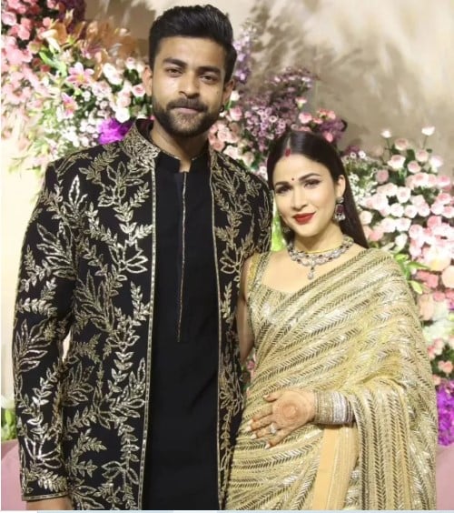 She paired her look with glam makeup, which included winged eyes, red lipstick, a bindi, and the sought-after middle-parted hairdo with vermillion. The wide neckpiece and matching earrings added charm to her look. On the other hand, varun looked very handsome in a black bandhgala suit with a golden jacket