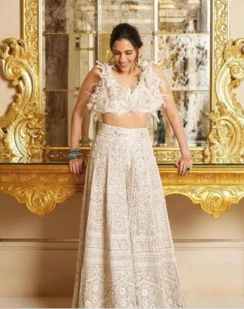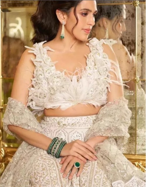 Shloka wore a white colored sharara, which had intricate floral embroidery and starwork. She styled it with a statement feather-detailed blouse in a matching color that featured a plunging neckline. Shloka completed her outfit with a sheer net dupatta with sequin work all over it.