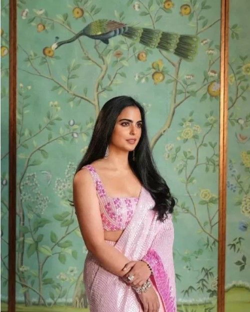 Isha had chosen a beautiful pink-colored ombre sequin saree for the party. The pallu of her saree had shades of green, which enhanced the overall look of the outfit. Isha styled her saree with a matching strappy blouse, which had a bead box pattern all over it. She opted for minimal accessories and makeup to complete her look. Isha enhanced her look with diamond earrings, a bracelet, and a heart-shaped ring. Dewy makeup and open hair added beauty to Isha's look.