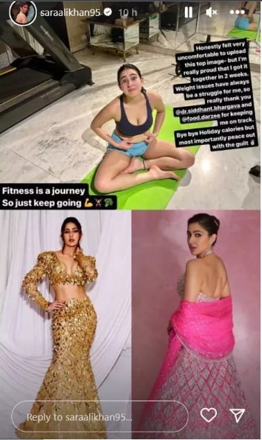 Taking to her instagram Stories, sara wrote, “Honestly, I felt very uncomfortable uploading this top photo, but I'm proud that I got it in 2 weeks. Weight issues have always been a struggle for me, so really thanks to @dr.siddhant.bhargava and @food.darzee for keeping me on track. Goodbye to vacation calories, but most importantly, make peace with the guilty feeling. Fitness is a journey so just keep going.'' She shared a collage of her pictures from a recent event and one of them shows her belly fat.