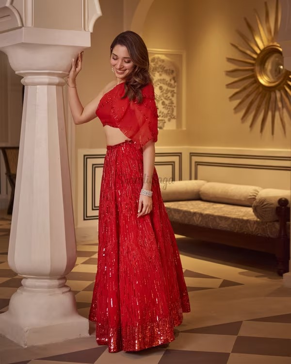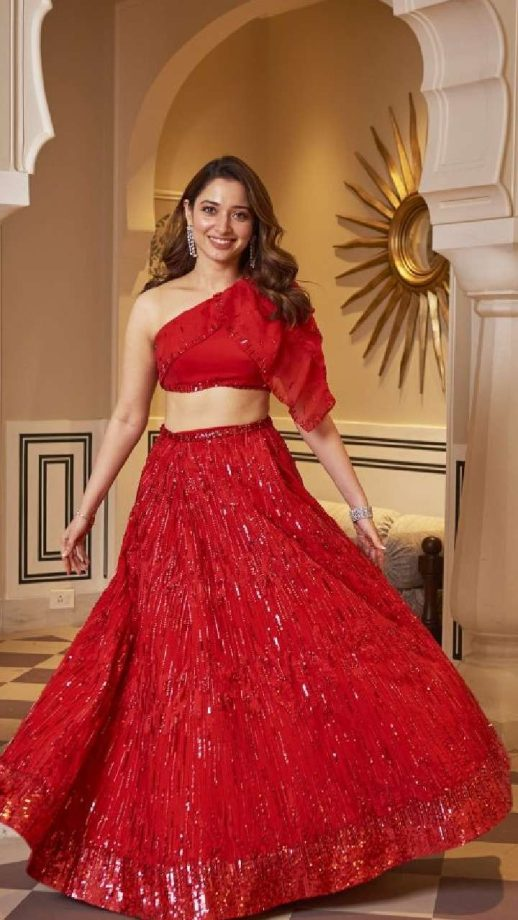If you want to include a Western touch into your Navaratri attire, tamannaah bhatia is the ideal source of inspiration. tamannaah looks stunning with a similar red skirt and a one-shoulder, ruffled red crop top that smartly serves as a blouse. The ensemble is ideal for anyone who like to dance to their own modern rhythm during Navaratri since it combines traditional colours with current flair. With her naturally curly blonde hair and a hint of subtle makeup, tamannaah displays a straightforward yet sophisticated makeover. For anybody hoping to make an elegant impression on the Navaratri dance floor, this blend of cultures, elegance, and style is ideal.
