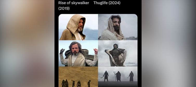 The collage shows how Kamal Haasan's depiction from Thug Life is quite similar to the main character from Rise of Skywalker. The pictures from both movies have strikingly identical outfits, colour schemes, and shot compositions. Due to the striking similarities, there has been conjecture on social media over whether Thug Life is a parody of or inspired by Star Wars: Rise of Skywalker. Some claim that the Thug Life crew has imitated the hollywood visual extravaganza's visual presentation.