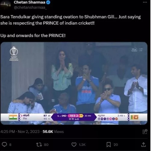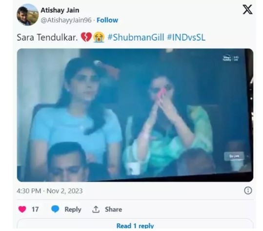 Shubman's performance in the current 'ICC world cup 2023' is praiseworthy. sara was also present to cheer him during a match of 'India vs Sri Lanka' on 1 november 2023. However, in the same match, Shubman missed scoring a century by eight runs. When he was dismissed by Sri Lankan bowler Dilshan Madushanka. However, it was Sara's disappointing reaction that grabbed all the headlines. Soon, some glimpses of sara Tendulkar were posted on 'X'. While in one photo she was seen standing and clapping for Gill, in the other photo she was seen disappointed after Gill was out.