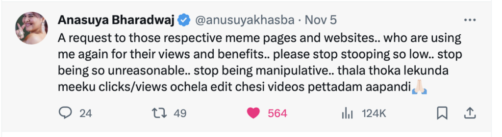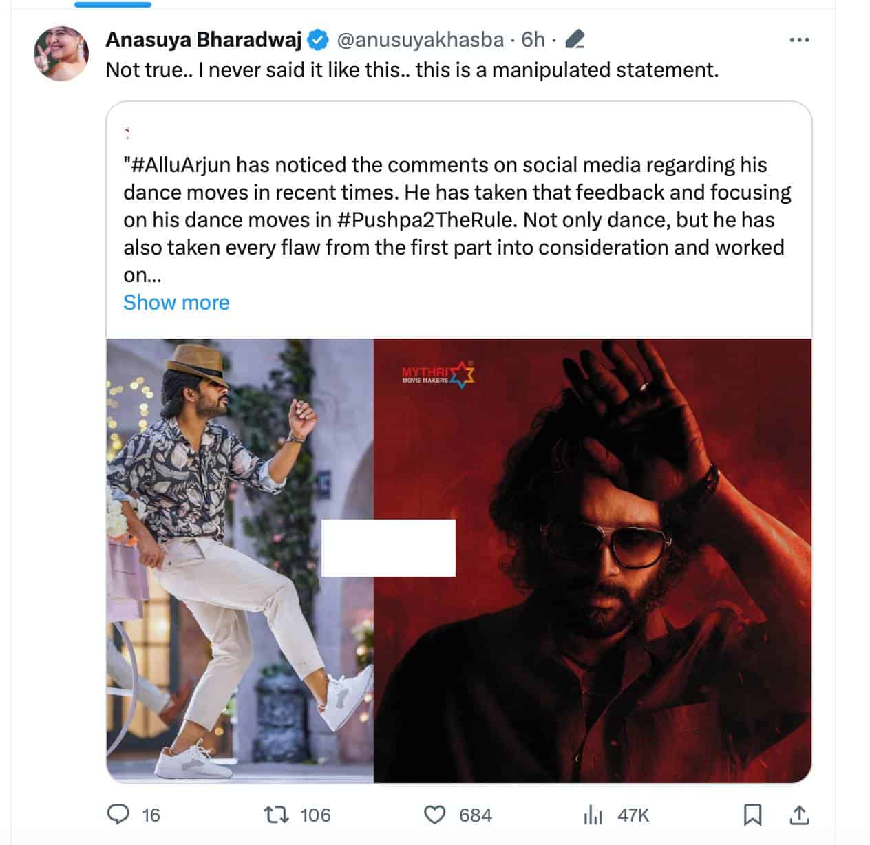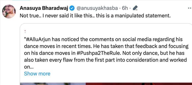 It seems that some media people cited anasuya to claim that allu arjun was disappointed by his subpar dances in pushpa 1 and is soliciting audience feedback on this. They also mentioned that allu arjun is soliciting audience feedback on other matters as well and will be exhibiting improvements pertaining to the same in pushpa 2. The top anchor has distanced herself from these remarks, though.“Not true; I’ve never said it like this. This is a manipulated statement” said anasuya, while commenting on a post that quoted her saying. Earlier the actress also asked everyone who was commenting on her to look at the full video and make comments, rather than spitting venom on her.
