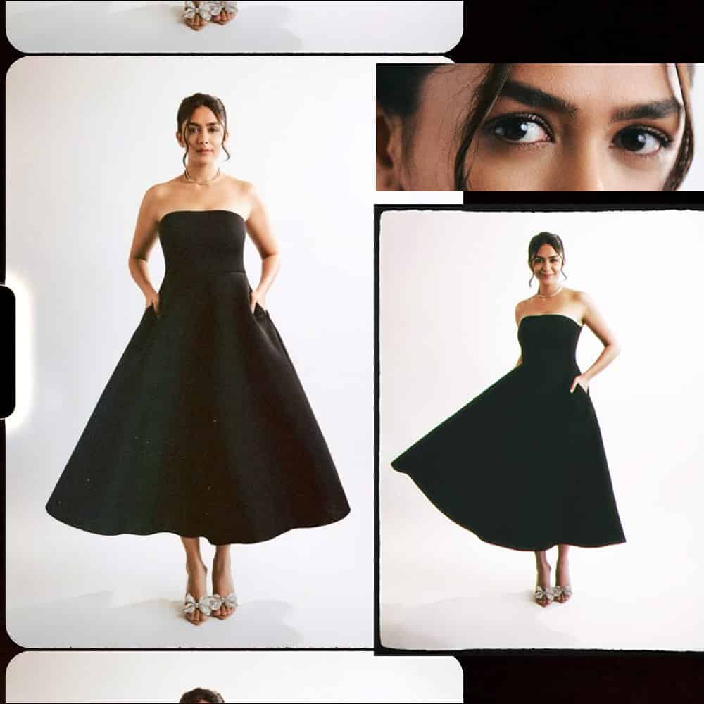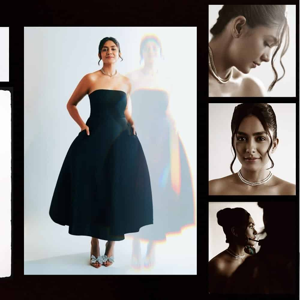 Mrunal chose a captivating black sleeveless gown that enhanced her charm for this advertising occasion. She exudes refinement as she wears a stunning diamond necklace and flower-shaped silver heels. The high bun completes the look and gives Mrunal an air of classic beauty. It also provides a touch of stylish charm. Fans and fashion aficionados alike are anticipating the actress's dress choices, which are expected to be as engaging as her on-screen persona as she prepares to promote Pippa.