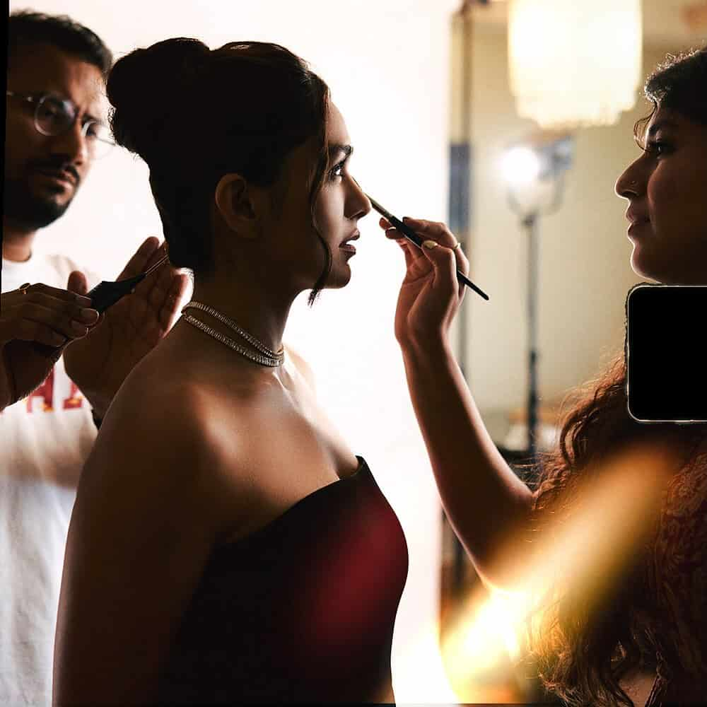 Fans have been given to behind-the-scenes looks at the gorgeous Mrunal Thakur, who is well-known for fusing charm and beauty with such natural ease. She is currently preparing for the marketing of Pippa, the highly awaited movie in which ishaan khatter co-stars. Mrunal radiates grace and confidence in every picture, guiding her fans through hair and makeup routines and daring camera postures.