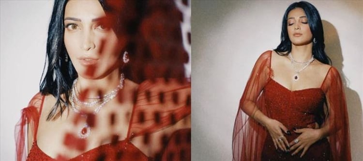Shruti Haasan draws attention with her sense of style as she pairs an embroidered blouse and trousers in a ruby red color. The Ramaiya Vastavaiya star started using the X (formerly Twitter) account. She added big sleeves to both sides of the outfit. Her diamond jewelry, which included a striking red ruby necklace and bold rings, perfectly matched the outfit. shruti effortlessly emanated refinement and style with her hair let loose and her makeup applied in a nude manner.