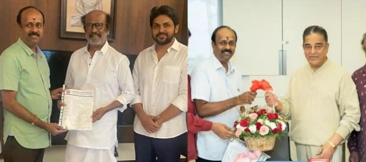 Accordingly, while the artist's centenary celebration is planned to be held at the Nehru Indoor sports Stadium in Chennai, the executives have personally visited and invited prominent celebrities including Rajini and Kamal. Accordingly, tamil Film Producers Association President N. Ramasamy, Secretary R. Radhakrishnan, Actors Association President Nassar, Vice President Poochy Murugan, Pepsi President rk Selvamani personally visited Superstar Rajinikanth and kamal haasan on behalf of the festival committee.