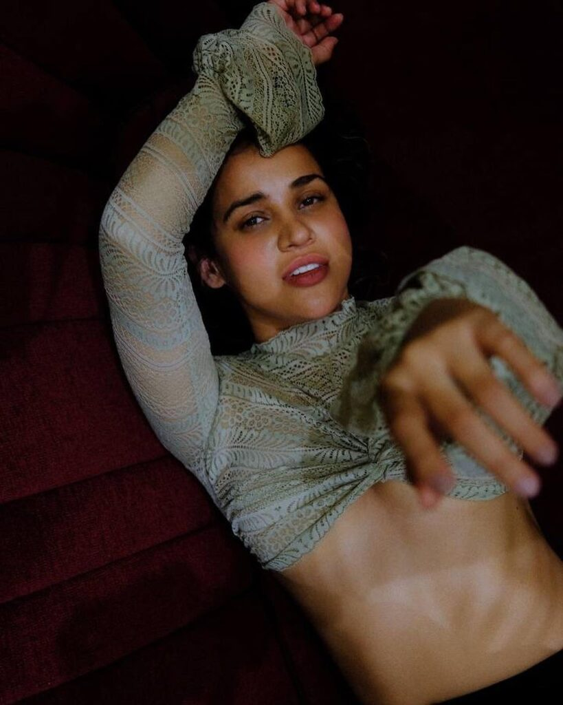 One can't help but be pulled to Aisha's pure hotness as she flaunts her chiseled stomach and wonderfully toned abs. The green crop top suits her form, emphasizing her curves and providing an added depth of elegance to the photographs' overall attractiveness. Renowned as both a model and actress, she consistently raises the bar for sexiness, sensuousness, and sultriness with each captivating photoshoot.