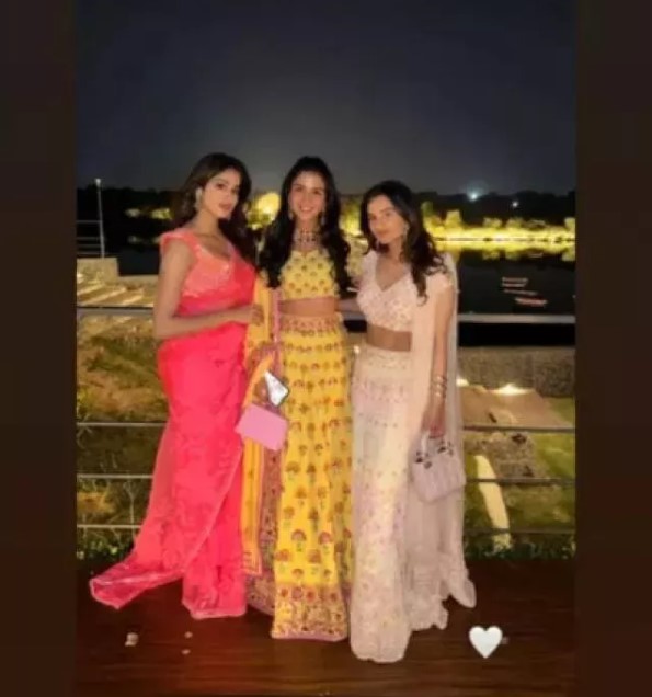 Recently, janhvi kapoor reposted a story shared by radhika Merchant on her instagram handle. In the picture, Nita Ambani's future daughter-in-law can be seen posing with Janhvi and one of her friends as they attended a wedding together.Apart from this, the trio gave some major fashion goals with their respective outfits. For the wedding, Janhvi looked beautiful in a pink saree, which she styled with a stunning blouse, earrings, dewy makeup, and open hair. Whereas, radhika Merchant looked very beautiful in a yellow-colored lehenga.