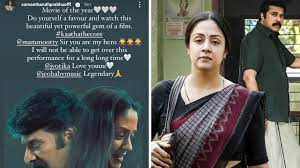 Popular actress samantha opens up about malayalam superstar Mammootty's recently released romance film. She said on her instagram page that it is the best film of the year. The malayalam film Kaadhal: The Core was released in theaters on november 23. It stars mammootty as retired bank officer-turned-politician Mathew Devassi and Jyotika as his wife Omana Mathew. The film revolves around their marriage dynamics amidst the village community. Most notably, Kaadhal: The Core sees mammootty take on a character unlike any he has ever played before, which turns into a fight with his wife Jyotika, and the resulting legal battle. This affects Matthew's political field and the lives of the people around them.Directed by jio Baby, who made the critically acclaimed film The Great indian Kitchen, Kaadhal: The Core is receiving a huge response. Notably, this is the first film with mammootty and Jyothika. The film is produced by Dulquer Salmaan's Wayfarer Films, and scripted by adarsh Sukumaran and Paulson Skaria. In a story published on her instagram page, famous actress samantha said that the movie has become the best movie of the year. If you want to do yourself a favor, please go and watch this movie. mammootty sir, you are my hero, from this character of yours. It will take me a long time to recover, I love you Jyothika," she wrote in her post.