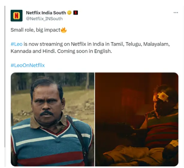 Netflix has also bought the rest of the movie Leo. In other words, LCU was brought in because the Leo movie was a disappointment. In particular, George Marion, who acted in the film Prisoner, also played the same police character as napoleon in the film Leo. His character in Kaithi made a huge impact but not as much as he did in Leo. In this context, Netflix has posted his photo on its X site.
