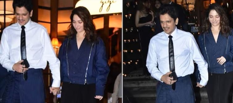 During the release of their anthology 'Lust Stories 2', bollywood actresses tamannaah bhatia and vijay varma made their romantic connection public. They were photographed leaving a mumbai eatery together last night. They walked together. tamannaah looked lovely in a long black gown, while Vijay looked suave in a white shirt with a black tie and blue trousers. She hid behind Vijay's blue shirt and huge jacket. The pair also mentioned the paparazzi.
