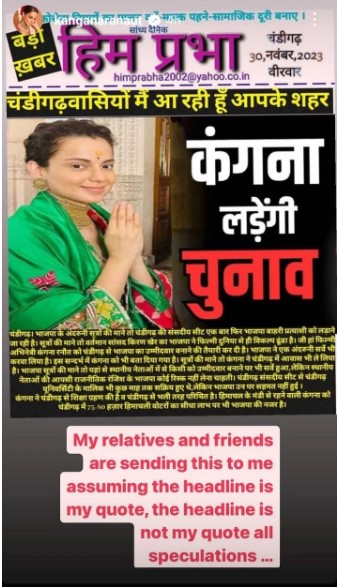 Recently, kangana reacted to the viral news on her instagram story and said that it was a lie. He shared a picture of a hindi news report and clarified that the headline was not given by him. kangana wrote, "My relatives and friends are sending it to me assuming that I have given the headline, but this headline and news have not been given by me."