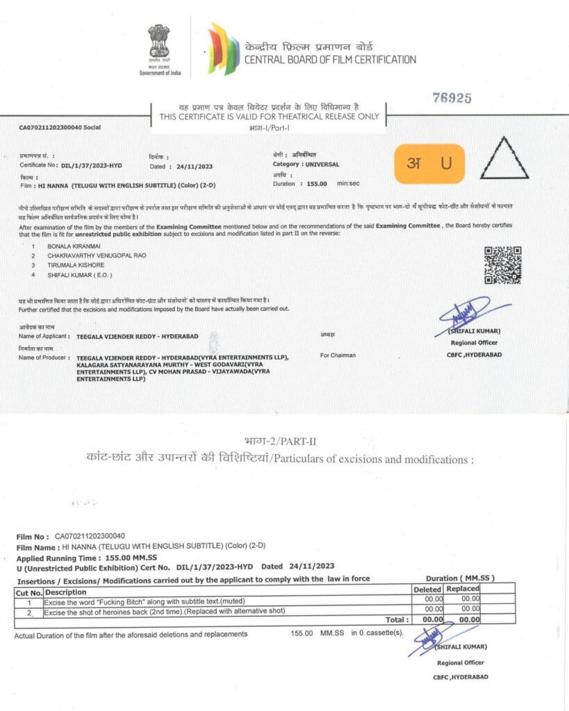 The excisions include 'Fu**ing Bi*ch' and subtitle text (muted), as well as removing the shot of the heroine's back for the second time and replacing it with an alternate shot. Hi Nanna will be available on december 7th. Mrunal Thakur and kiara Khanna play pivotal parts, and shruti haasan appears in a special song.