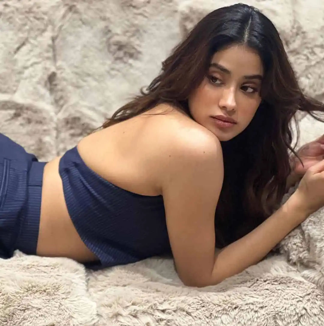 Janhvi Kapoor exudes classic elegance in a sleeveless blue-striped power suit, displaying a great balance of refinement and charm. Janhvi easily redefines the bounds of formal attire as she creates sensuous positions while resting on a sofa, showing that elegance and sensuality can coexist.