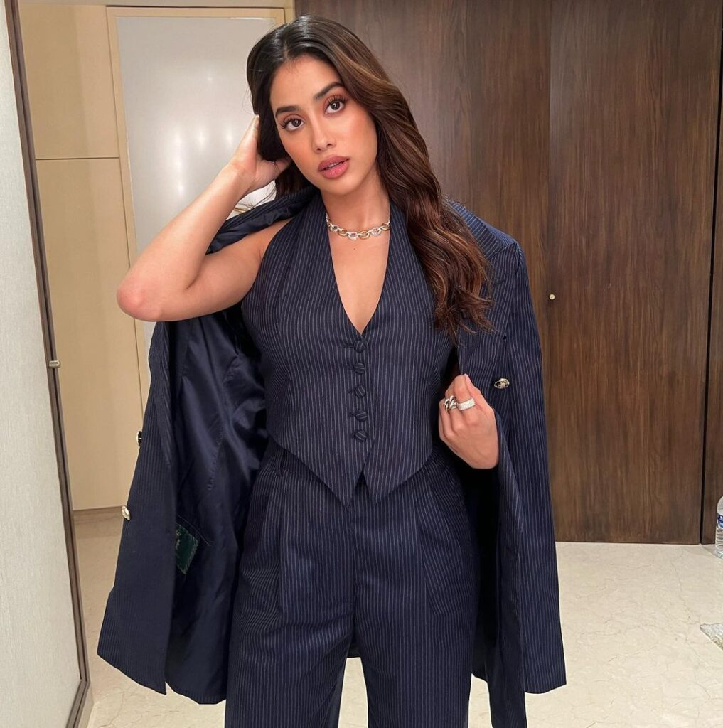 The sleeveless silhouette gives a modern touch to the classic power suit, emphasising Janhvi's confidence and fashion-forward approach. The blue stripes provide a sense of vibrancy to the ensemble, breaking away from typical uniformity and injecting it with a vivid energy. Janhvi catches attention with an obvious atmosphere of attraction in each position, demonstrating that formal dress can be both strong and sensual.