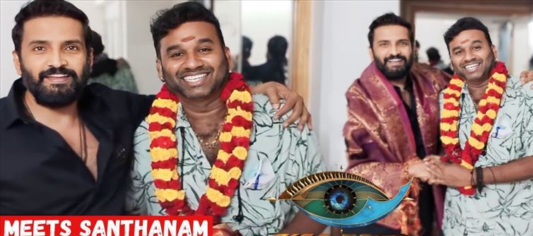 This caused him to get less votes and he was evicted from the bigg boss house last week. While many people have been giving their support to him after leaving the bigg boss house... Cool suresh has met his friend Santhanam. The video and photos of Santhalum garlanding Cool suresh and wearing a bonnet are going viral.