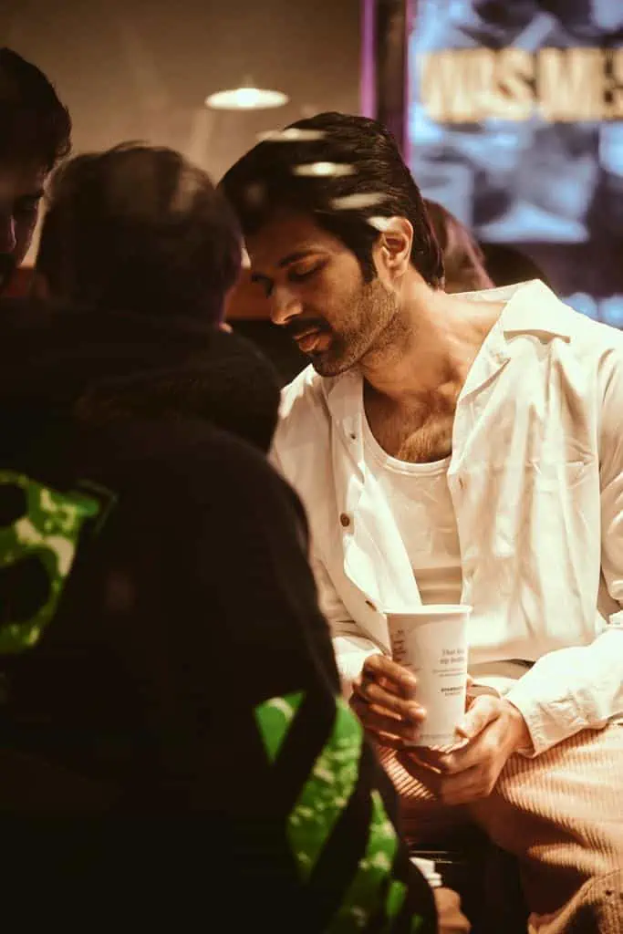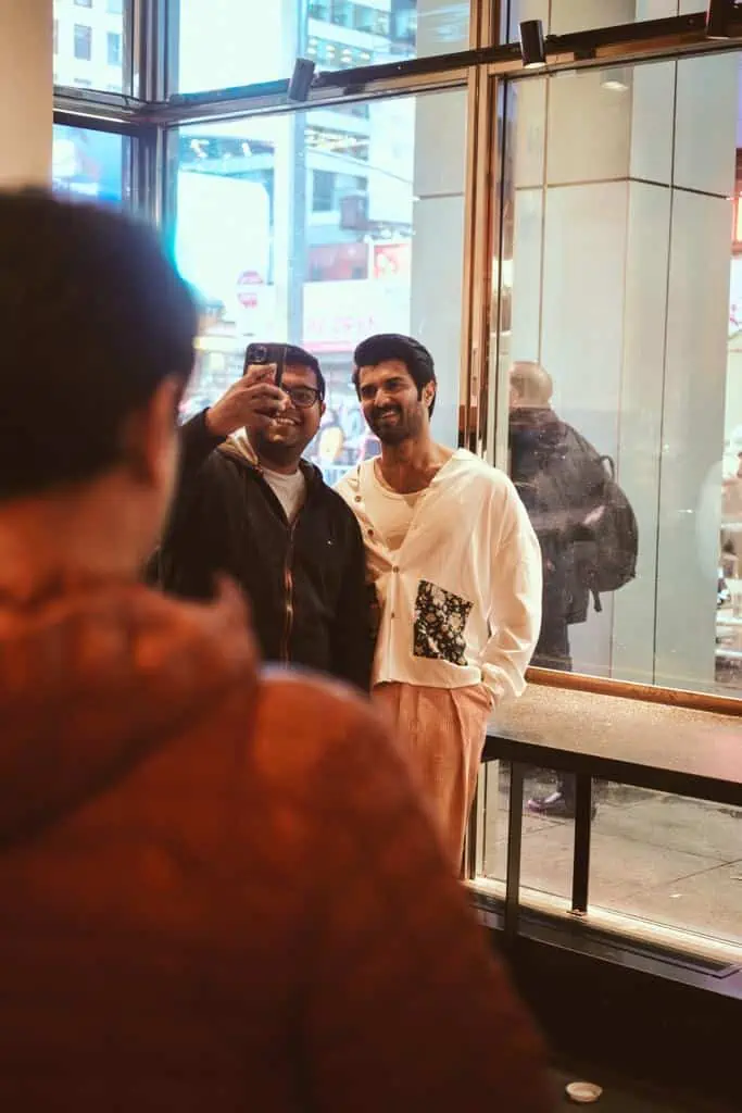 While in the city that never sleeps, Vijay devarakonda took advantage of the opportunity to record behind-the-scenes footage of his forthcoming film, "Family Star," co-starring the amazing Mrunal Thakur. Vijay enjoyed a leisurely coffee break amid the bustling streets of New York, dressed casually yet stylishly in a fresh white shirt and beige trousers.