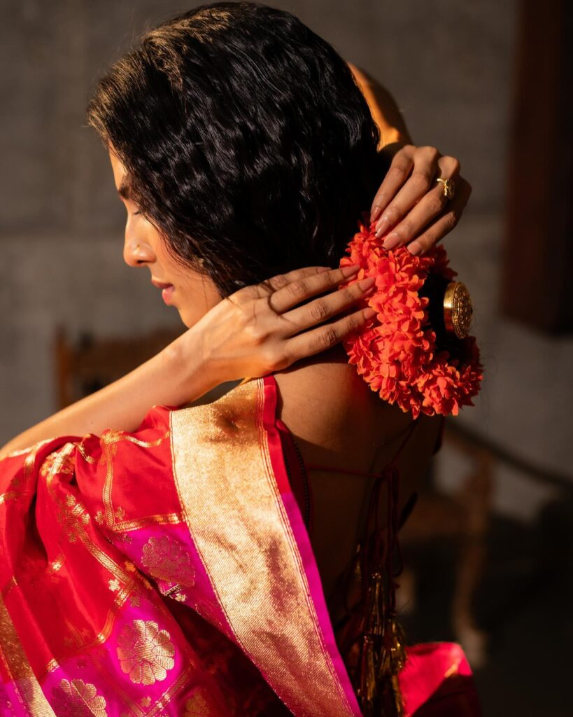 She has made a strong design statement by foregoing standard accessories, allowing her clothing to take centre stage. Malvika wears a beautiful crimson lipstick on her cascading curls, emphasising her gorgeous look.