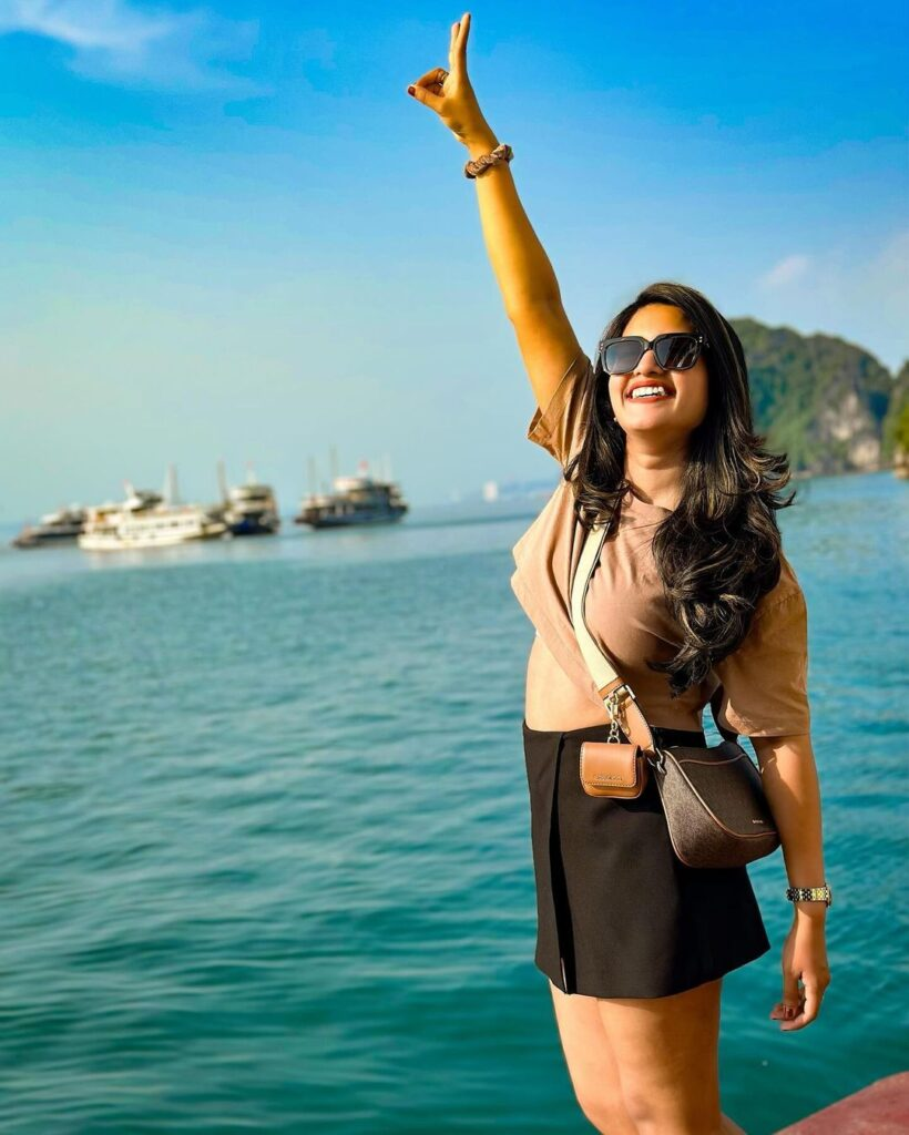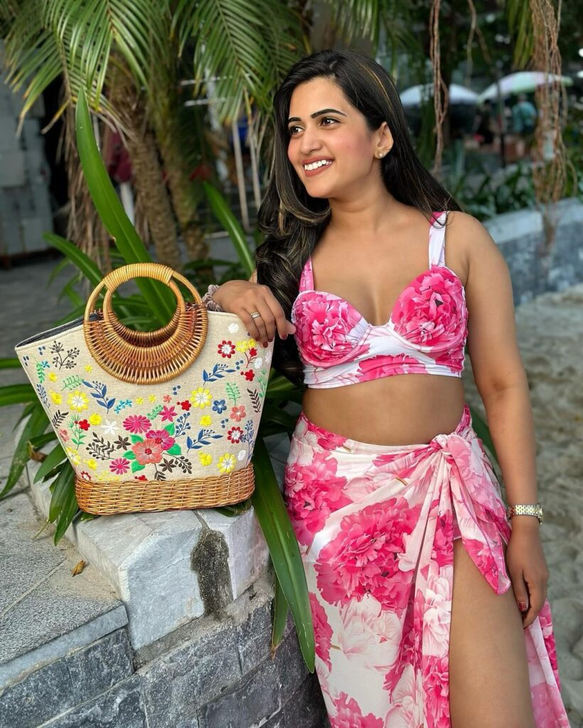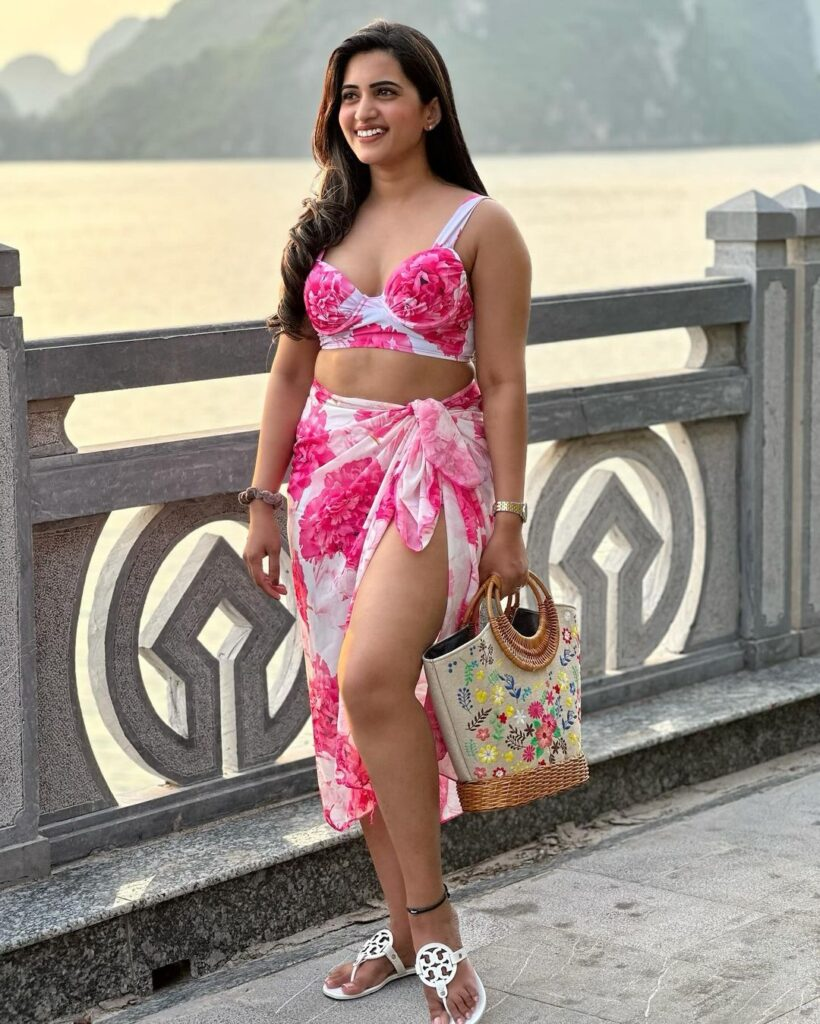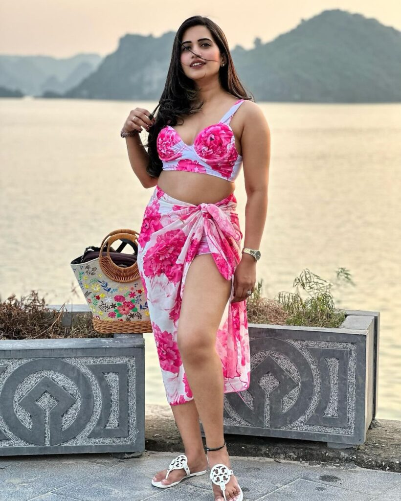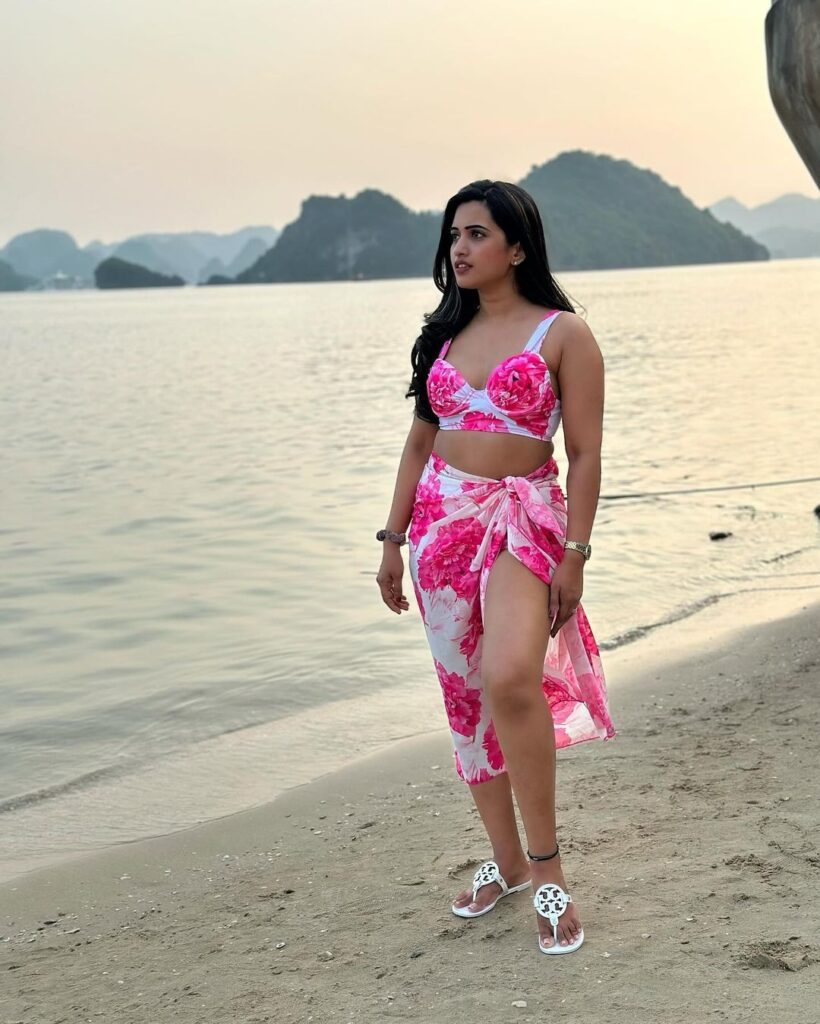 Sravanthi Chokarapu, a former YouTube host turned actor recognised for her interesting character parts in films, is igniting social media with her hot presence. She is now on vacation in Vietnam, where she is easily raising the temperature with her wardrobe choices. During her vacation, Sravanthi was seen wearing a stunning flowery pink bralette with a smart skirt, displaying a great blend of elegance and attractiveness.