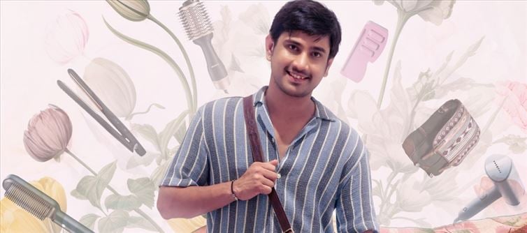 Raj tarun looks stylish in fashionable clothes, carrying a bag on his shoulder. We can see flowers and various make-up items in the backdrop. The actor who had a makeover appears sleek and attractive here. The film's female protagonist is Manisha Kandkur, with famous Singeetham srinivas set to play a key part. Shekar Chandra composed the film's music, and nagesh Banella handled the photography.