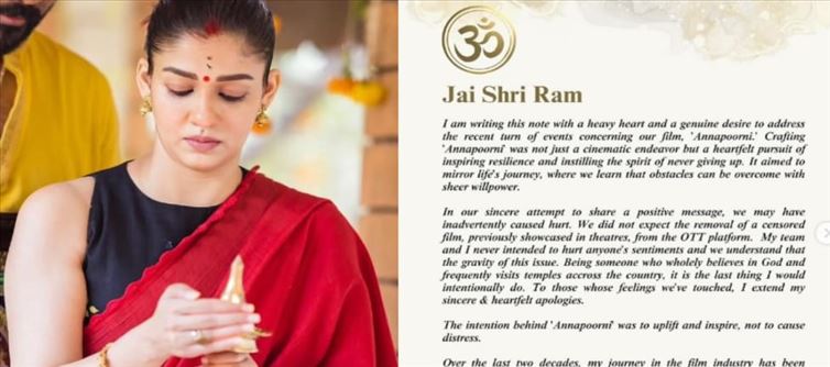 ఈ విషయాన్ని తెలియజేస్తూ ఇంస్టాగ్రామ్ లో జై శ్రీరామ్ అంటూ కూడా ఒక విషయాన్ని తెలిపింది.. గత కొద్దిరోజులుగా తన సినిమా పైన చర్చనీయాంశంగా మారుతోంది .ఈ విషయం పైన బరువెక్కిన హృదయంతో ఇలాంటి ప్రకటన చేస్తున్నానంటూ తెలిపింది..అన్నపూరణి సినిమా కేవలం కమర్షియల్ ఉద్దేశంతోనే కాకుండా ప్రజలలోకి ఒక మంచి ఆలోచన తీసుకువెళ్లాలని ప్రయత్నం చేశాను ఏదైనా దృఢ సంకల్పంతో పోరాడితే కచ్చితంగా సాధించవచ్చు అనే కథాంశంతో ఆలోచనతోనే ఈ సినిమాను చేశాను.. అయితే మాకు తెలియకుండానే కొంతమంది మనసులను గాయపరిచాయని తెలిసింది.. సెన్సార్ సభ్యులు ఓకే చేసి థియేటర్లో విడుదలైన సినిమా ఓటిటి నుంచి రిమూవ్ చేయడంతో ఆశ్చర్యపోయాను.. అందుకే ప్రతి ఒక్కరికి క్షమాపణలు చెబుతున్నానంటూ తెలిపారు.