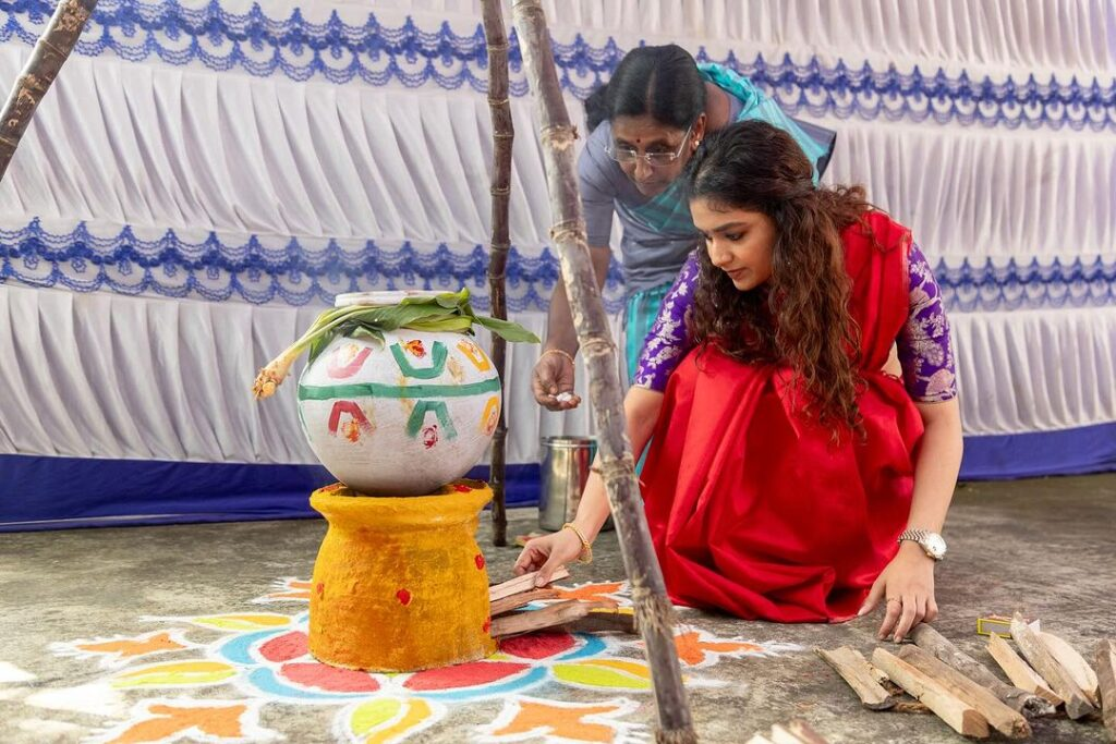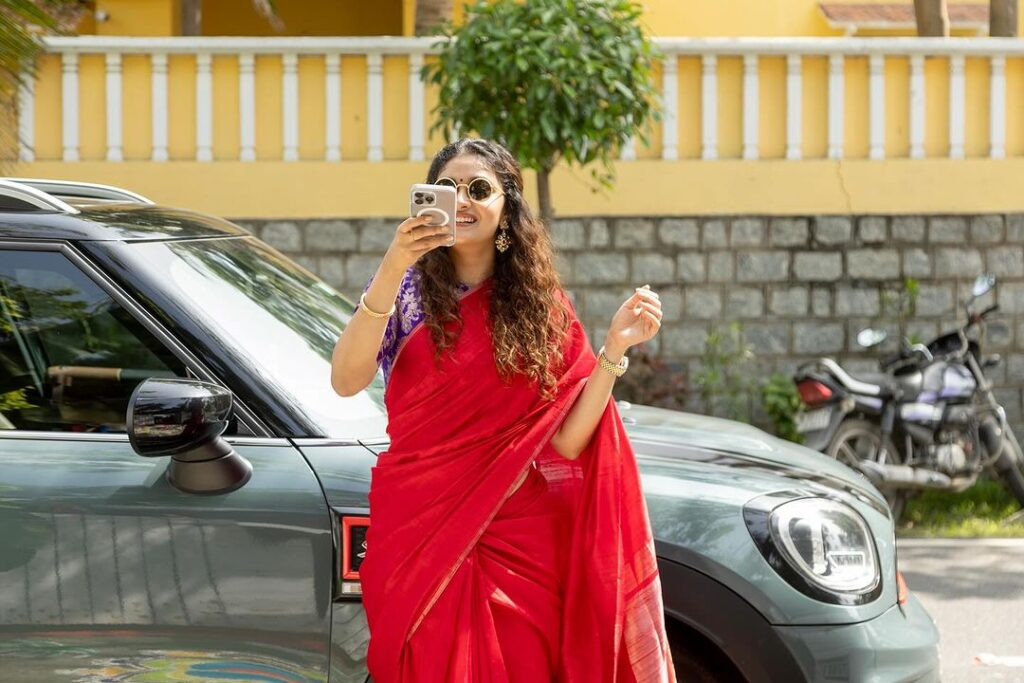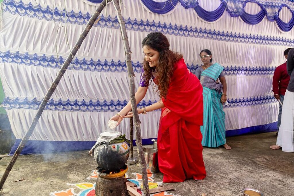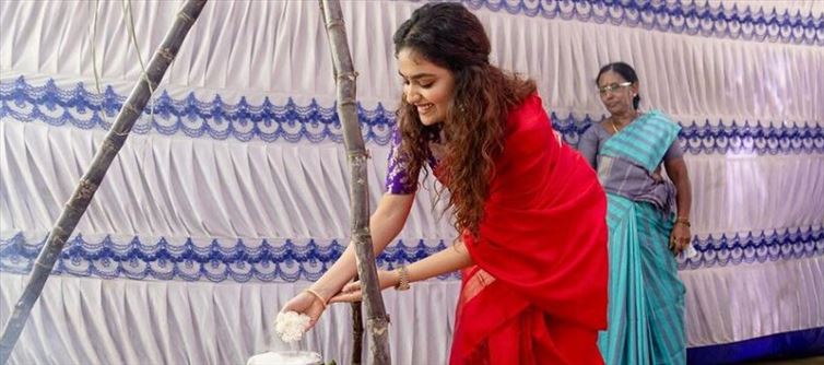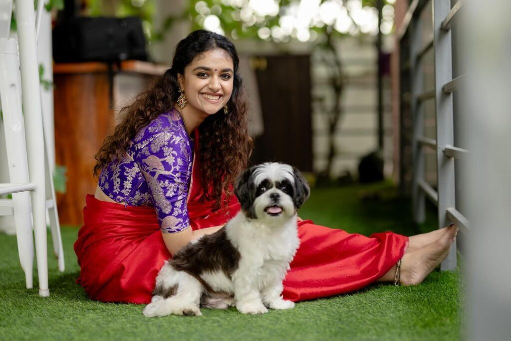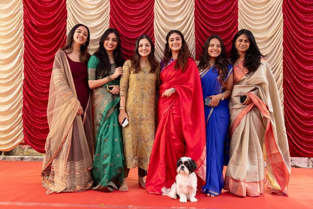 Despite her hectic schedule, the gorgeous Keerthy suresh exudes breathtaking beauty as she joyfully celebrates the festival with a distinct South indian flair. She captures every aspect of the festivities, giving readers a look into her exuberant celebrations—cooking with enthusiasm, creating colorful rangolis, laughing with family, and cherishing moments with her darling puppy. She embodies a sense of authentic joy while wearing a beautiful crimson sari.