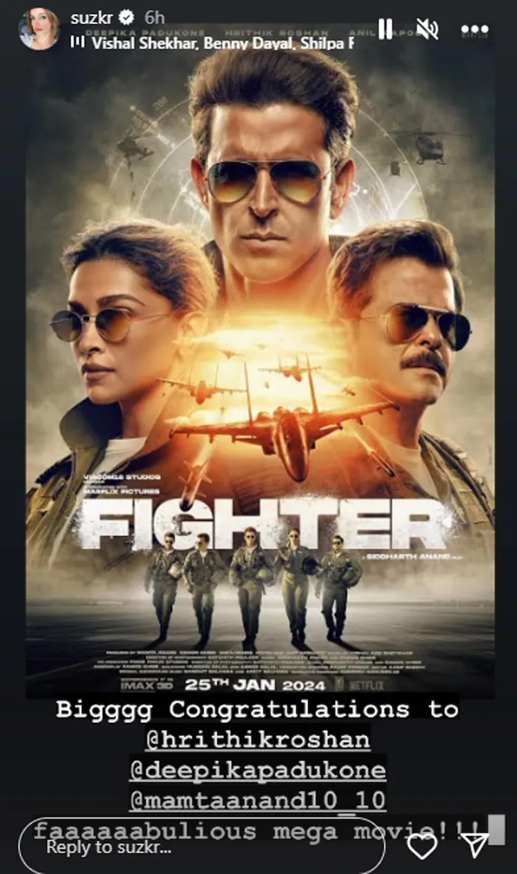 'Fighter' also stars Anil Kapoor, karan Singh Grover, akshay oberoi and Sanjeeda Shaikh among others in pivotal roles. After the star-studded screening of 'Fighter', Sussanne Khan gave a shout-out to the film. Sharing a poster on her Instagtram handle, she wrote, "Big congratulations to Hrithik Roshan, deepika Padukone. Fabulous mega movie (sic)." Sussanne had attended the screening with her sons Hrehaan and Hridhaan. The film, which received rave reviews from the fans on the opening day, witnessed a great start at the box office.