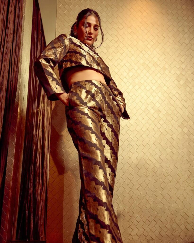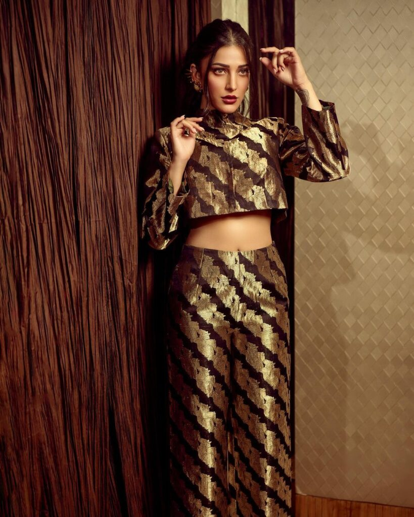 Shruti Haasan is raising heads once more with her gorgeous fashion choices! In a recent shot, she oozes sheer glamour in a brown and gold co-ord set that seamlessly blends earthy tones with glittering shimmer. The ensemble's elaborate design is visually appealing, with delicate patterns and textures lending depth and character. Her posture is both fun and composed, emphasising the stylish silhouette of the clothing. The high boots provide an edge to the whole outfit, while remaining fashionable.