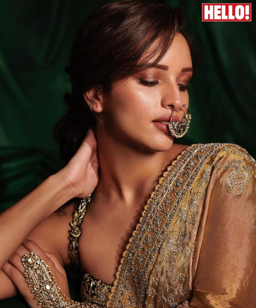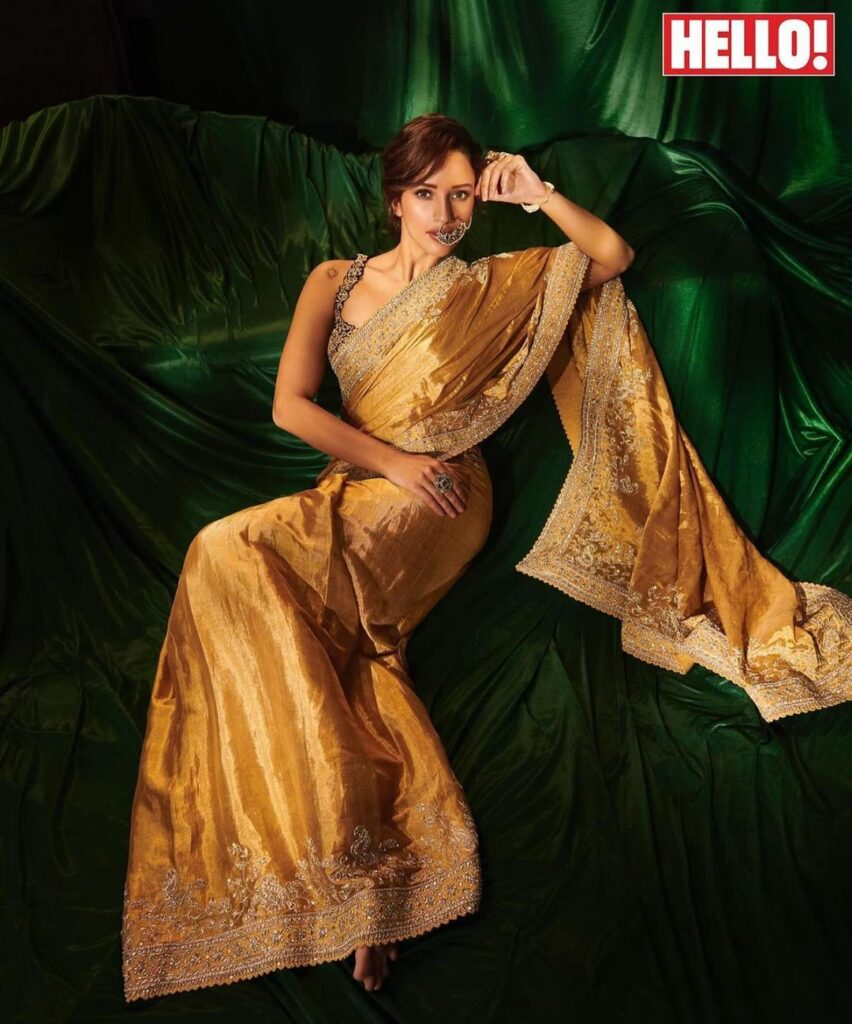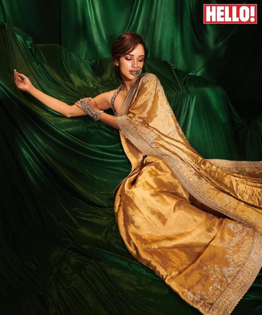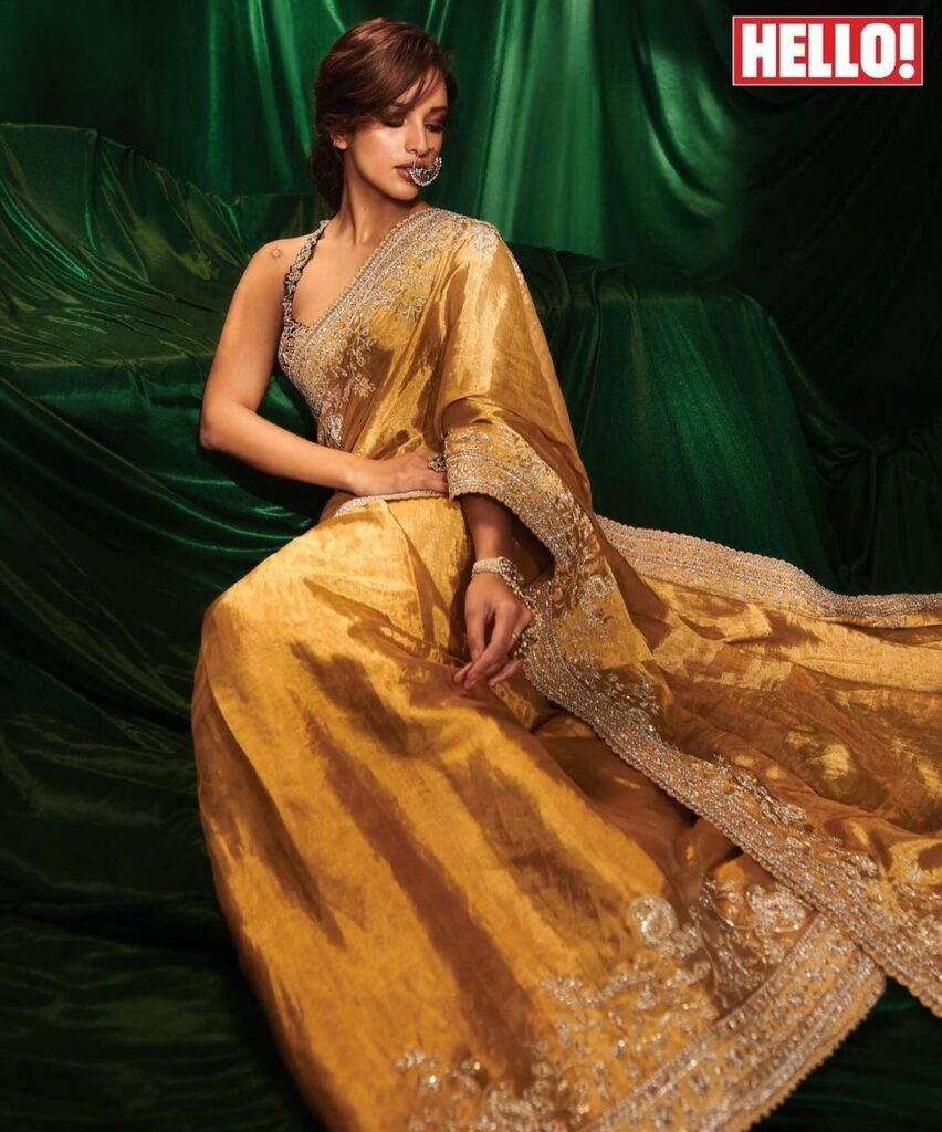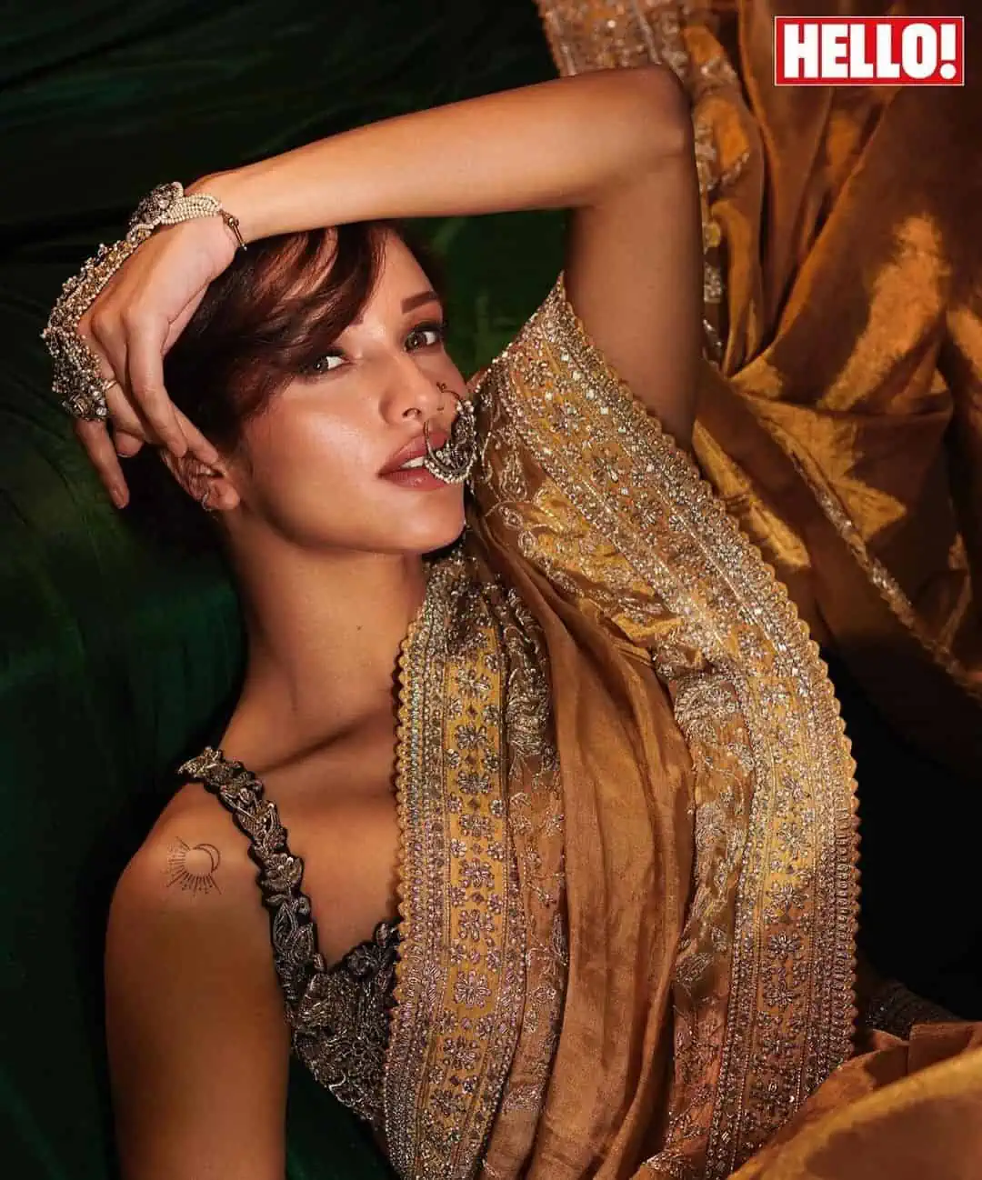 Tripti Dimri, the amazing actress from Ranbir Kapoor's recent film "Animal," appears on the cover of 'Hello' magazine, captivating everyone's attention with her lovely beauty. She exudes elegance and charm while wearing a lovely silk saree with elaborate golden embroidery and a sleeveless top. A statement huge nose ring completes the combination, giving a dash of daring to her image. Tripti takes a confident and alluring position, grabbing the camera's attention with her enticing stare.