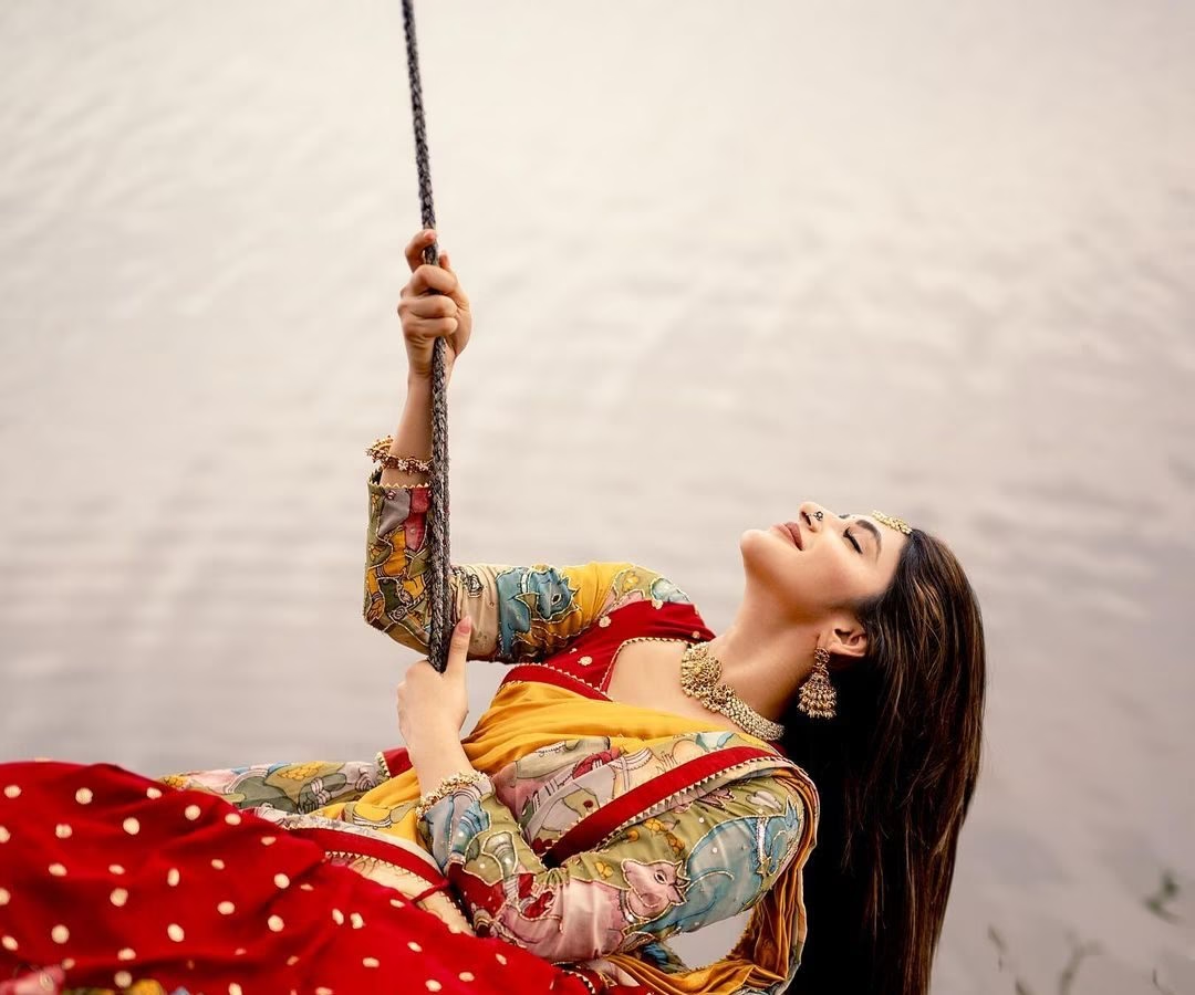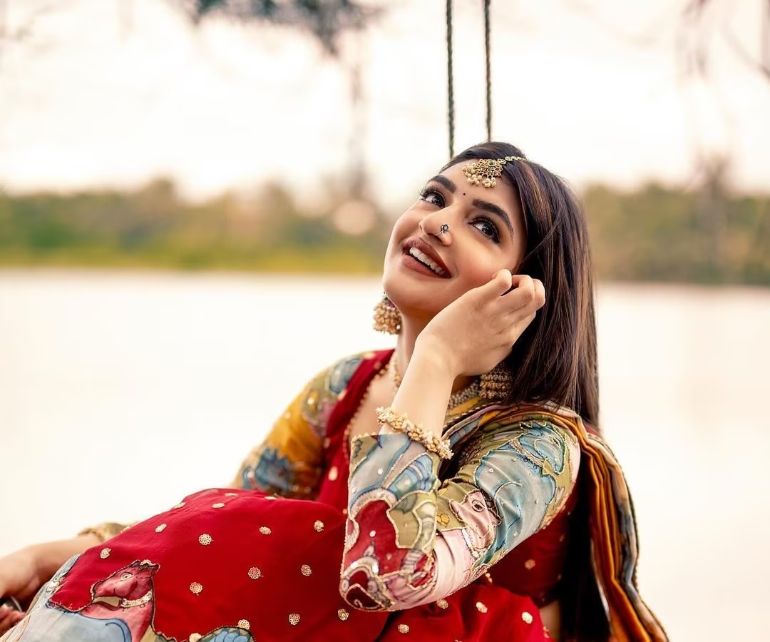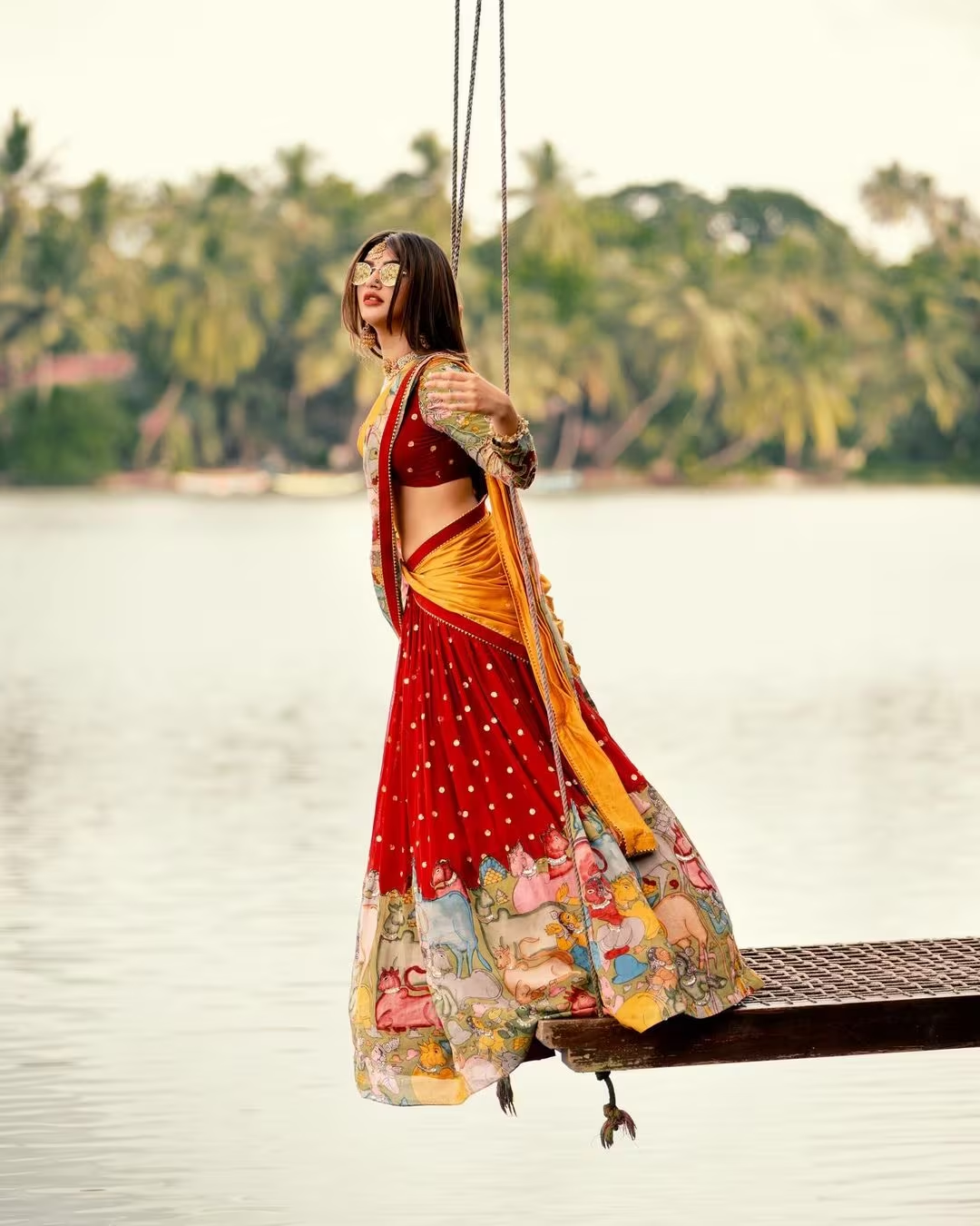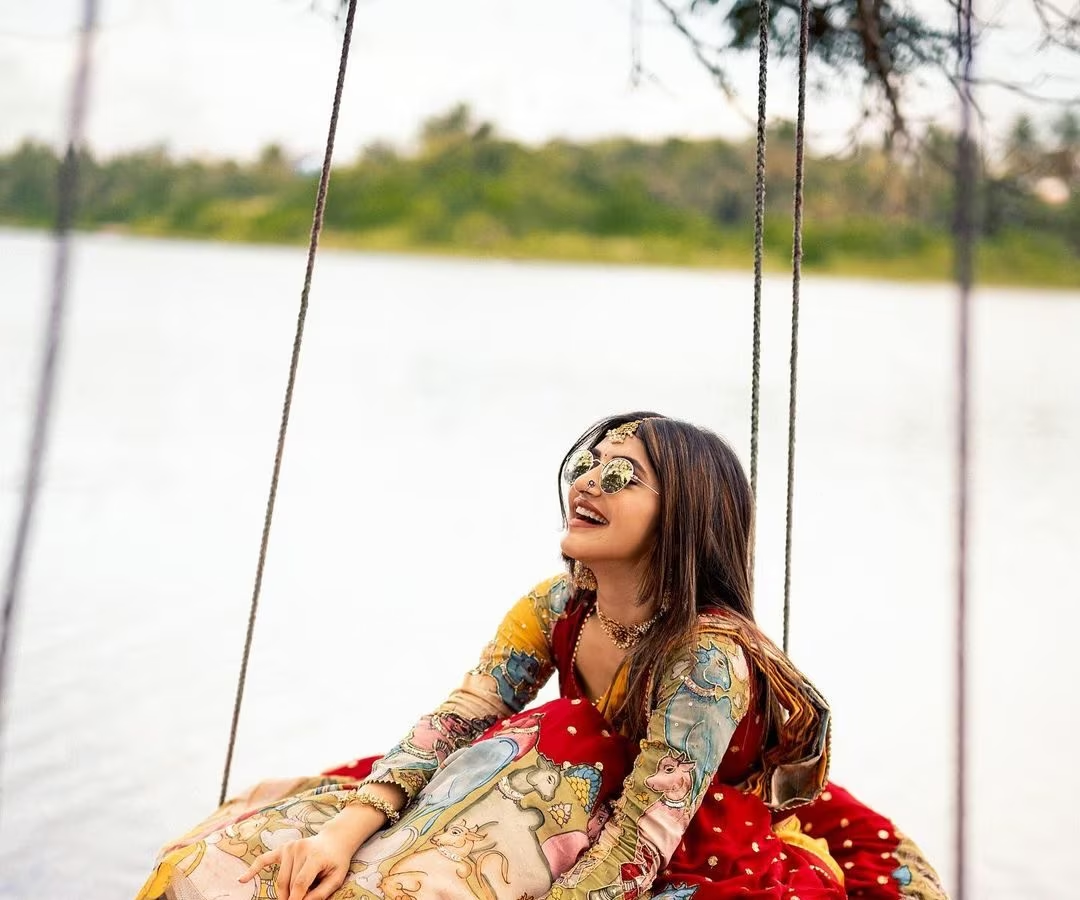 The actress recently did a beautiful photo shoot. She looks cute in red color floral skirt, red blouse and yellow davani. Sitting on a swing on the bank of the river, Srileela posed in a stunning pose. Her hair was left free but she was wearing beautiful jewelry. The actress posed coolly wearing necklaces, earrings and scalpel.