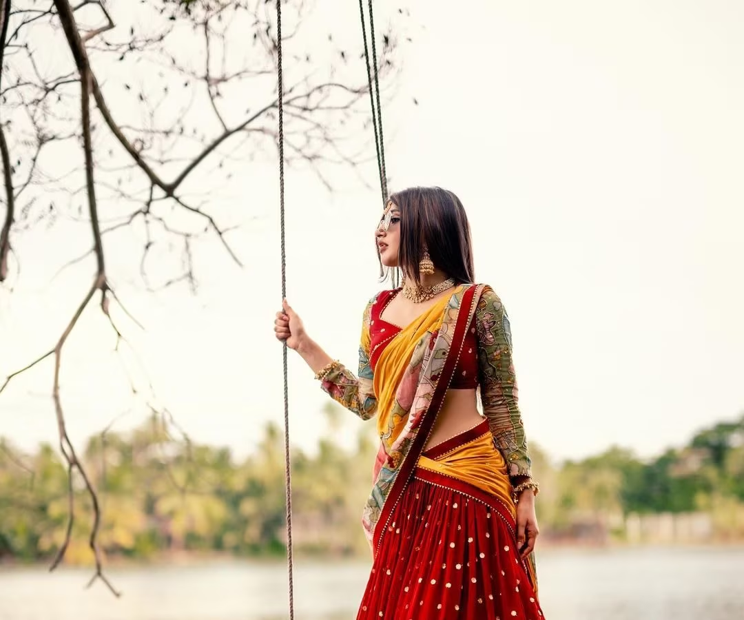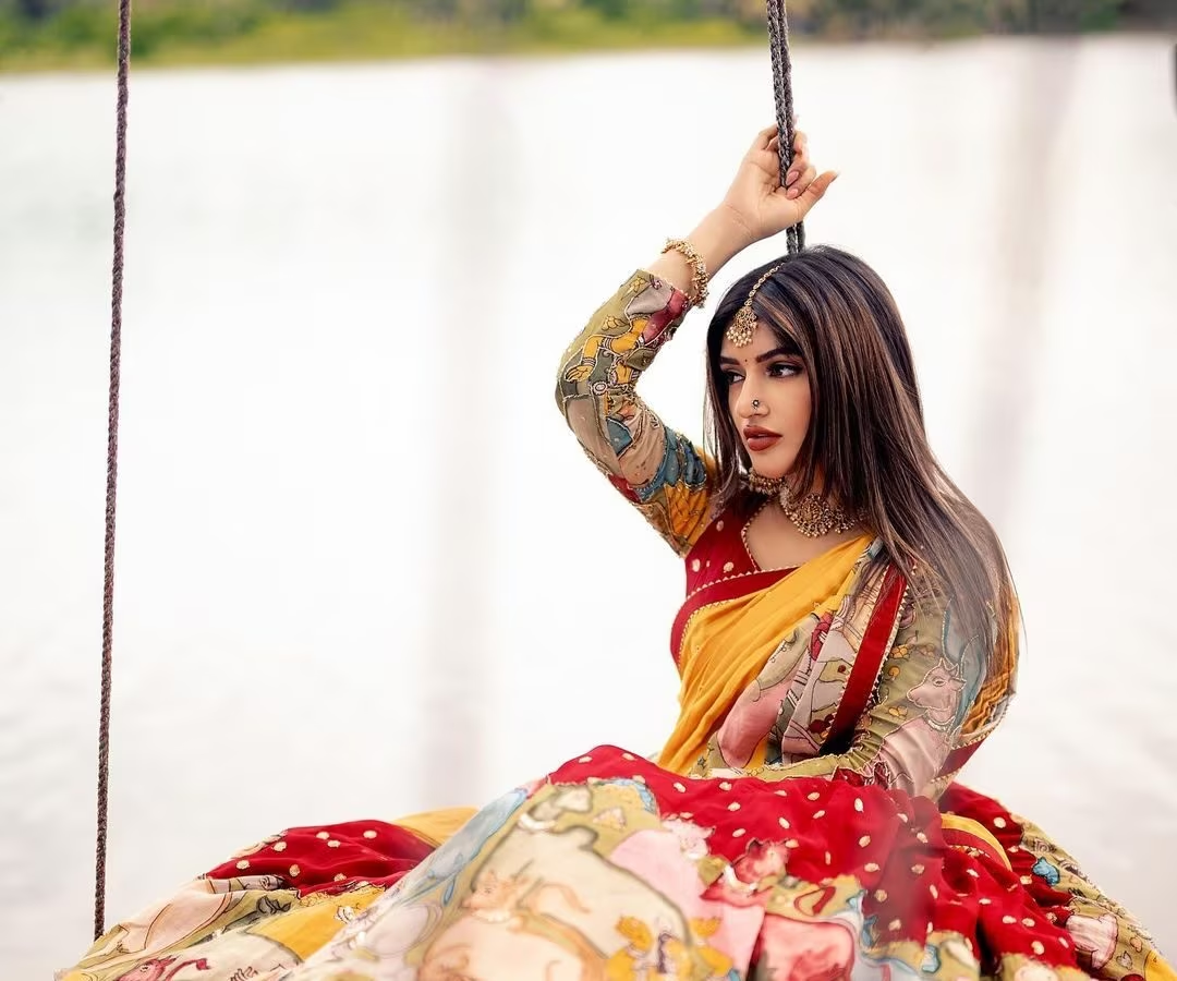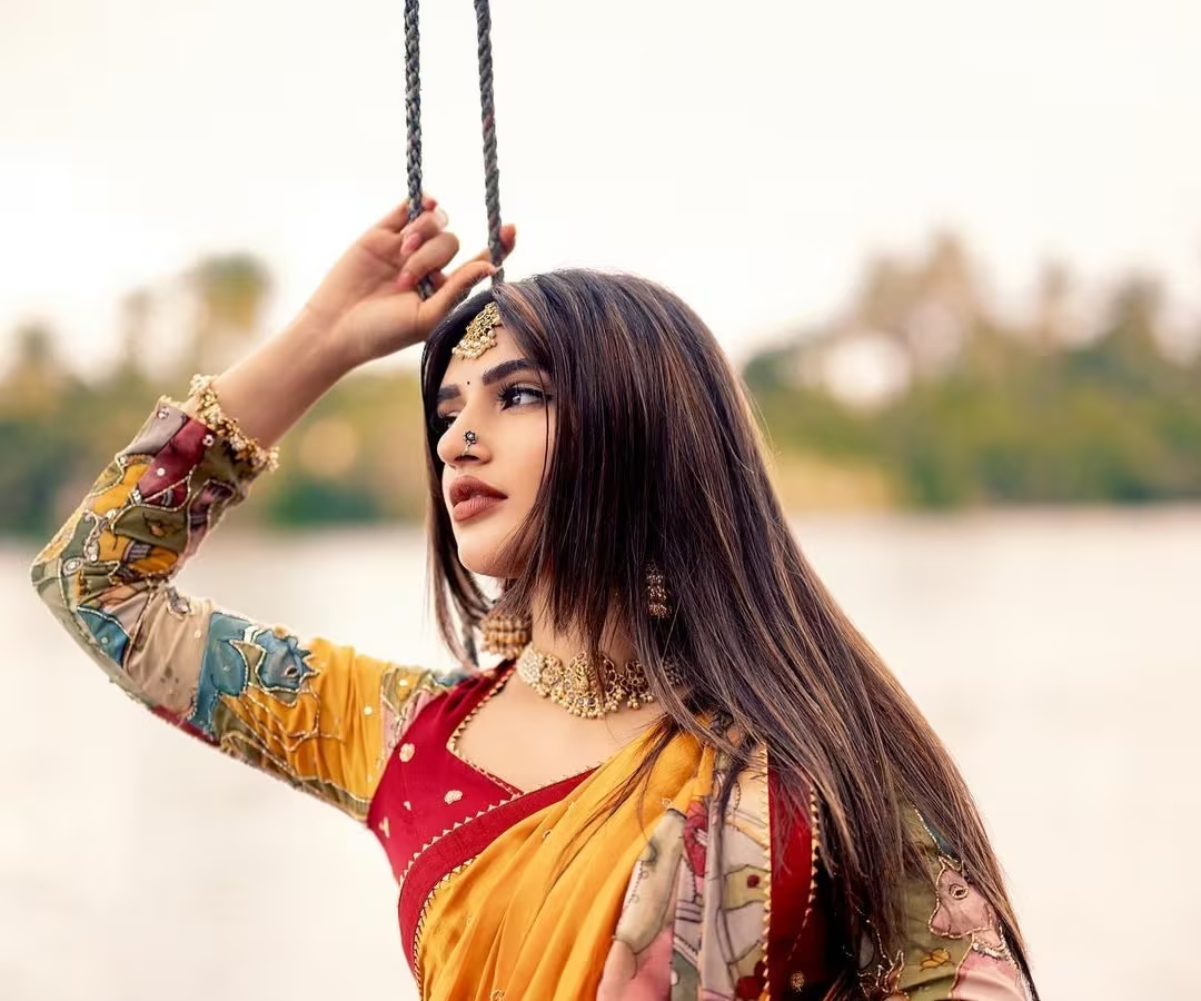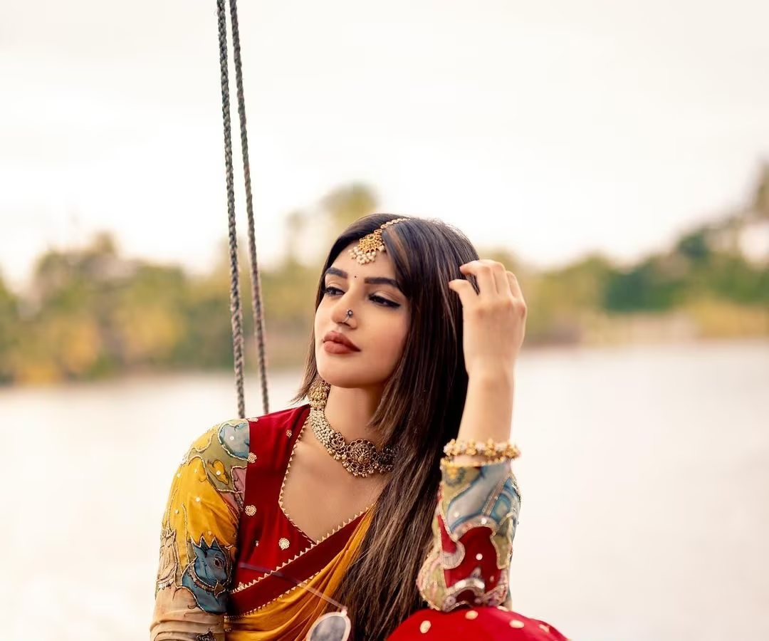 The actress recently did a beautiful photo shoot. She looks cute in red color floral skirt, red blouse and yellow davani. Sitting on a swing on the bank of the river, Srileela posed in a stunning pose. Her hair was left free but she was wearing beautiful jewelry. The actress posed coolly wearing necklaces, earrings and scalpel.