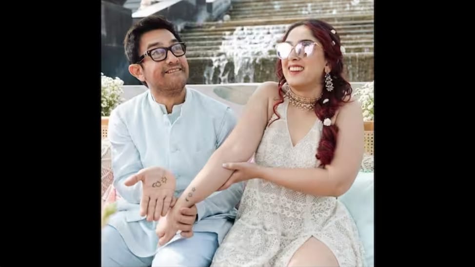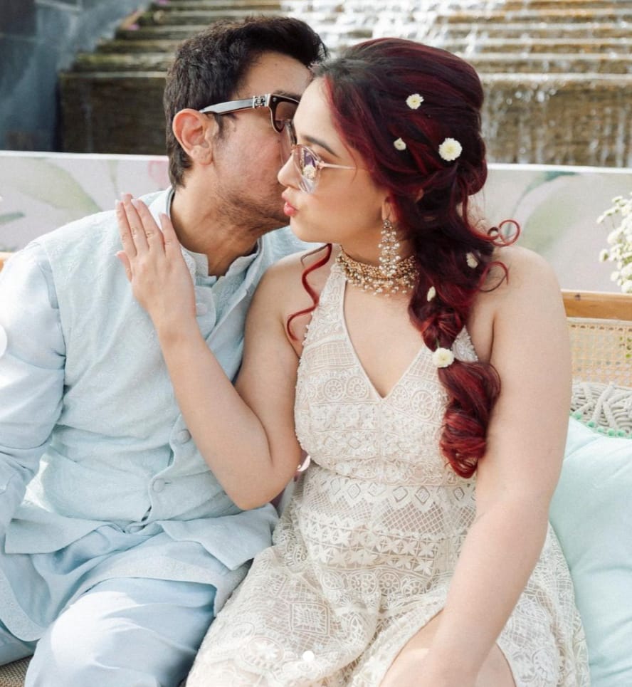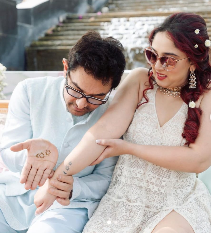 In the photos, Aamir is seen flaunting his mehendi design while wearing an ice-blue kurta pajama and a matching Nehru jacket. He is seen clutching Ira's hand and displaying her wrist tattoo, which he copied. Another photo features Aamir kissing ira on the cheek.