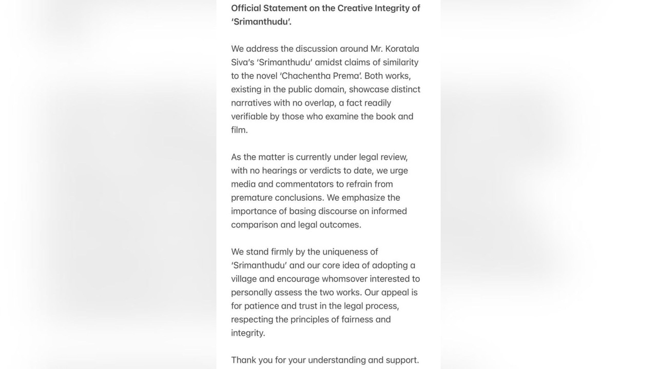 The legal struggle had been ongoing for some time, and with rumours spreading, the makers decided to reply to the claims by issuing a statement on Srimanthudu's Creative Integrity.