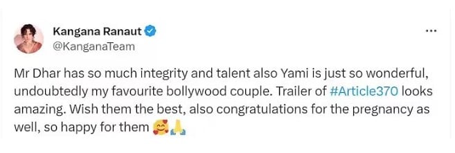 Kangana Ranaut shared the post and wrote, 'Mr. Dhar has a lot of honesty and talent. Apart from this, yami gautam is also very amazing. Undoubtedly this is my favorite bollywood couple. The trailer of 'Article 370' looks amazing. Best wishes to her, and also congratulations on the pregnancy. Very happy for him. yami gautam and uri director Aditya Dhar tied the knot in june 2021. The audience is eagerly waiting for his film 'Article 370', which is releasing on 23 February.