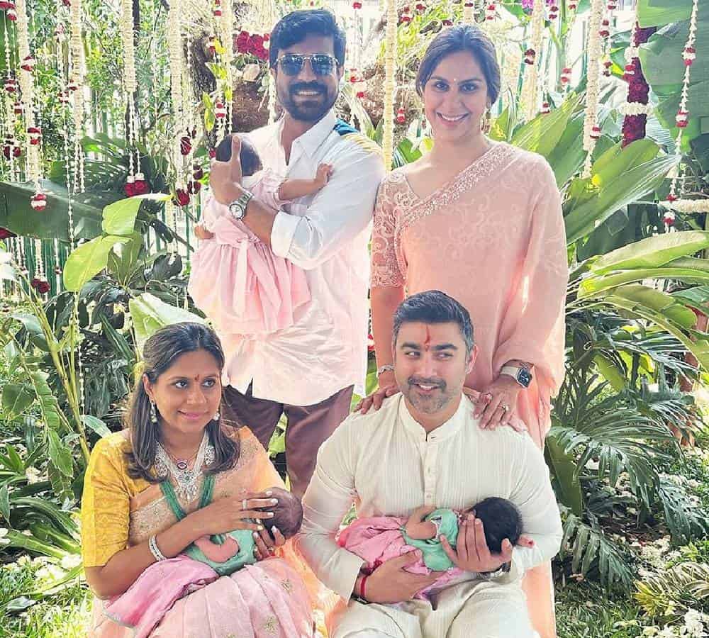 On Instagram, ram charan and his spouse upasana konidela shared some joyous news with their followers and admirers. The rrr actor ram Charan's wife posted a family photo of herself and her husband ram charan holding infant Klin Kaara on Monday. The photo also shows sister Anushpala and her husband Amran Ebrahim holding their own newborns. upasana shared the photo, which appeared to have been shot at the naming ceremony, writing, "Introducing the awesome threesome - power puff girls." Her two sisters join Klinkaara Konidela.
