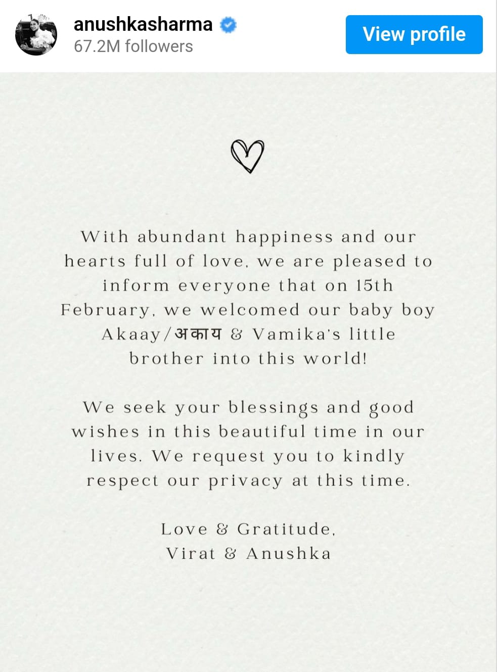 Taking to instagram, the couple wrote: “With abundant happiness and our hearts all of love, we are pleased to inform everyone that on 15th February, we welcomed our baby boy Akaay & Vamika's little brother into this world!