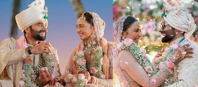 రకుల్ తన పెళ్లి కోసం పింక్ కలర్ లెహంగాను ధరించింది ఈ సమయంలో కూడా తన చేతులకు మ్యాచింగ్ బ్యాంగిల్స్ ని సైతం ధరించినట్టు కనిపిస్తోంది. అలాగే భారీ నగలతో కనిపించిన ఈ జంట షేర్ చేసిన ఫోటోలలో జాకీ ప్రేమలో రకుల్ మునిగి తేలుతున్నట్టుగా ఆమె కళ్ళలో కనిపిస్తోంది. రకుల్ జాకీ ఈ వివాహ ఫోటోలు కొన్ని నిమిషాలలోనే వైరల్ గా మారుతున్నాయి. ప్రస్తుతం వీరికి సంబంధించి ఈ ఫోటోలు సైతం సోషల్ మీడియాలో వైరల్ గా మారుతున్నాయి. పెళ్లి తర్వాత సినిమాలలో ఈ ముద్దుగుమ్మ నటిస్తుందో లేదో చూడాలి మరి.