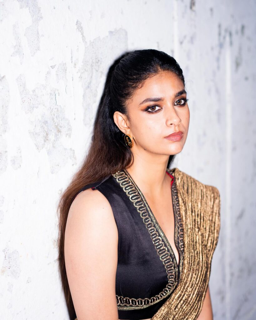 Keerthy embraced the persona of a posing queen with ease, attracting spectators with her grace and confidence as she posed against a backdrop. Her shape was emphasized by the elaborate golden patterning on her black saree, which also gave her look a hint of refinement. During the occasion, Keerthy's modest yet elegant style caught everyone's attention, especially with her loose hair flowing down her shoulders and her simple earrings worn on her ears.