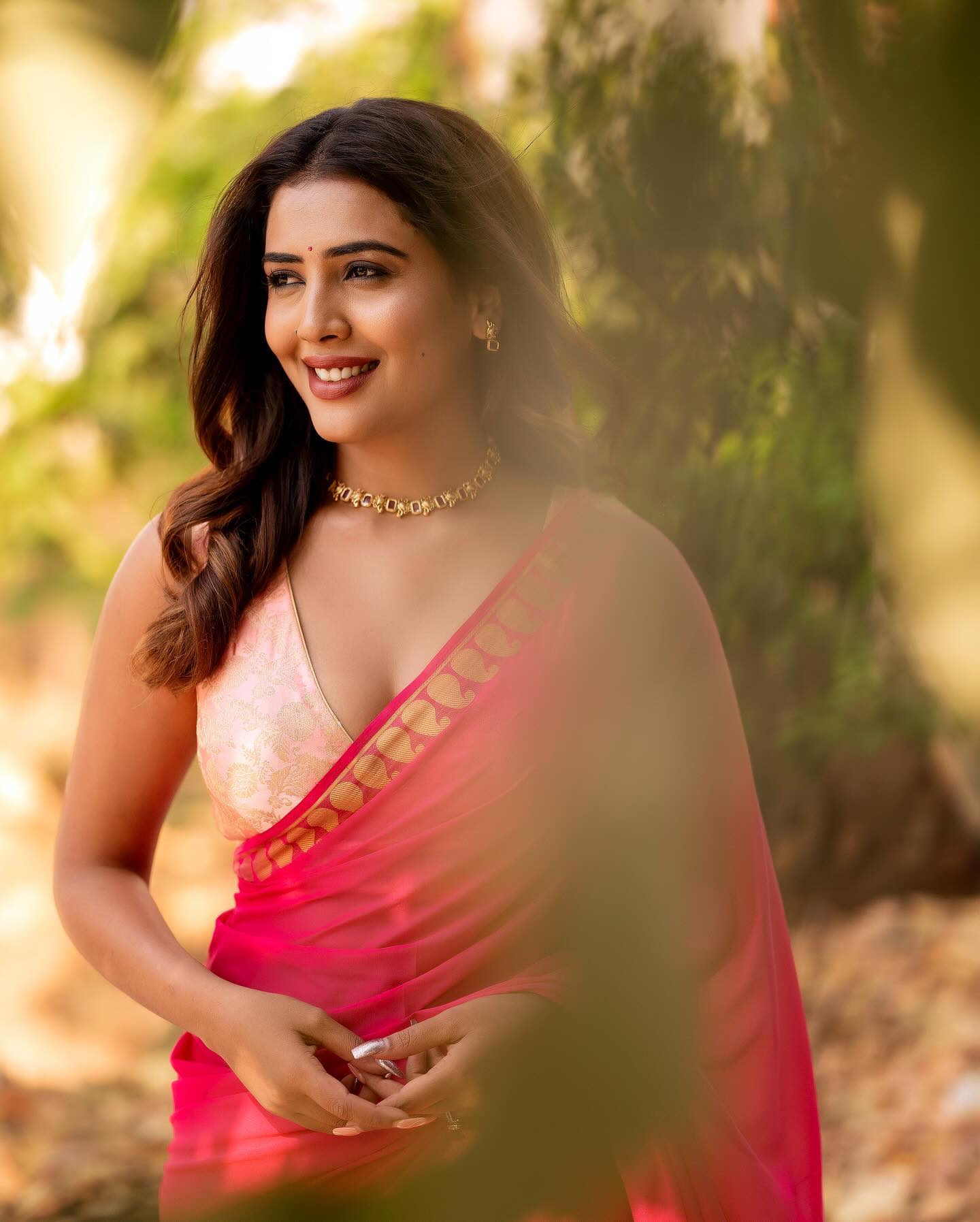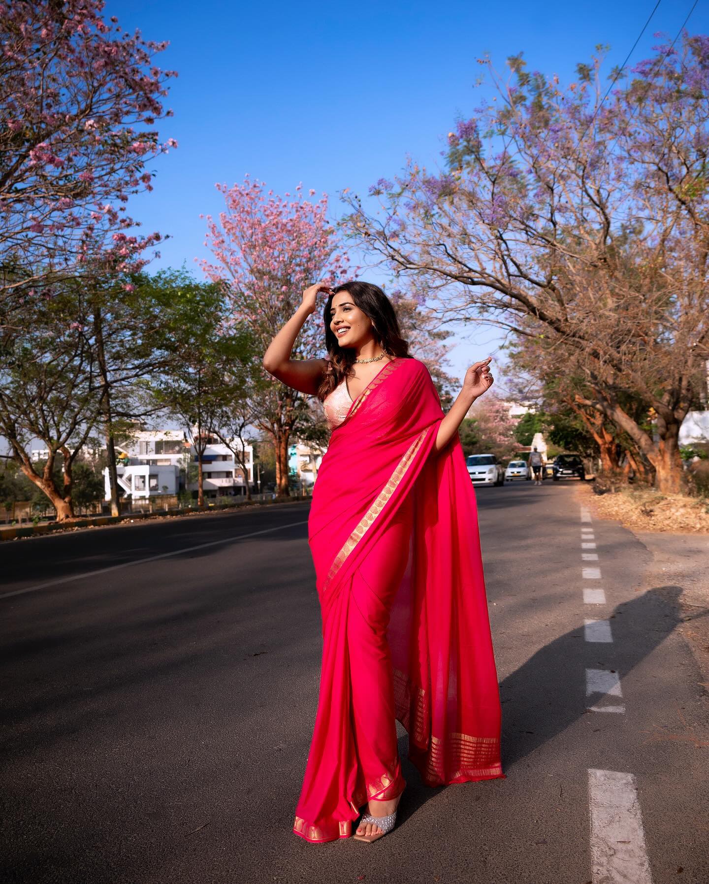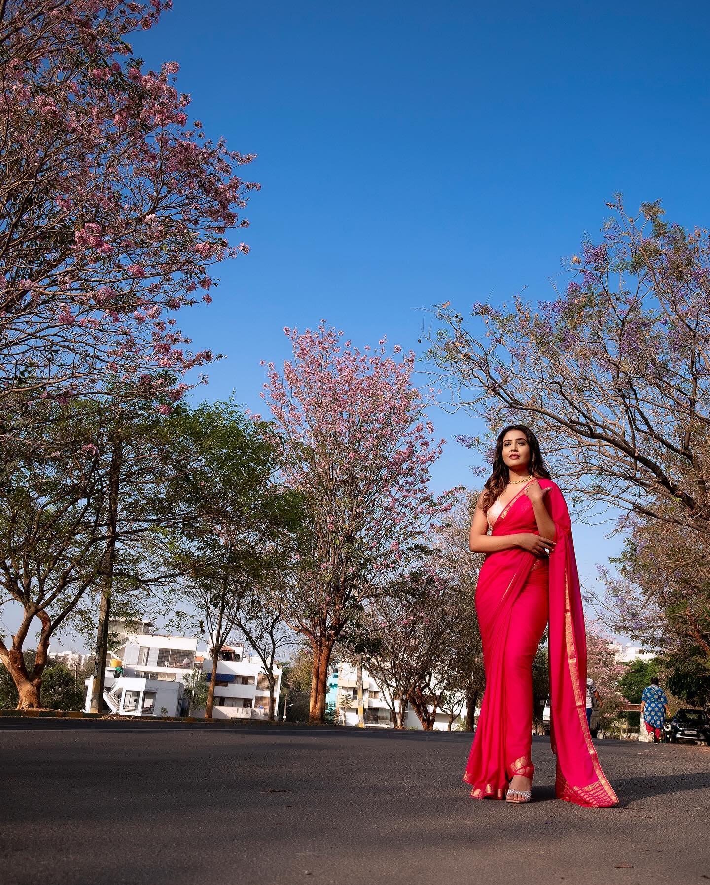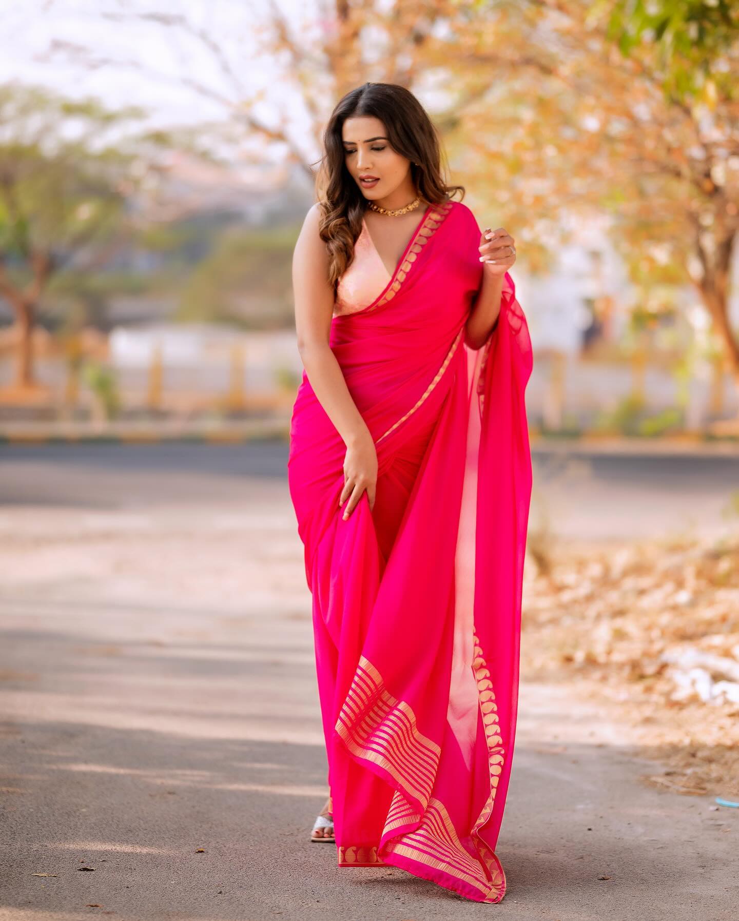Sara Annaiah uses social media quite a bit, and she frequently posts photos of herself with her followers. The actress is seen in a stunning pink saree in her most recent instagram photo. sara is posing naturally for the camera while wearing an incredibly intricately woven saree with a golden border. She accessorised the saree with a sophisticated golden blouse with cut sleeves.