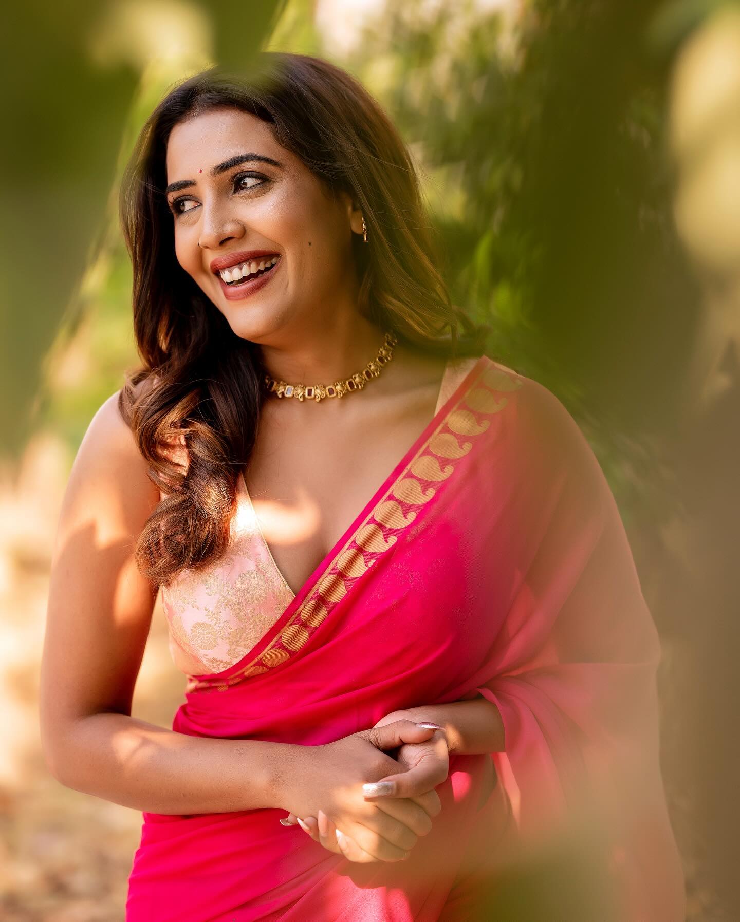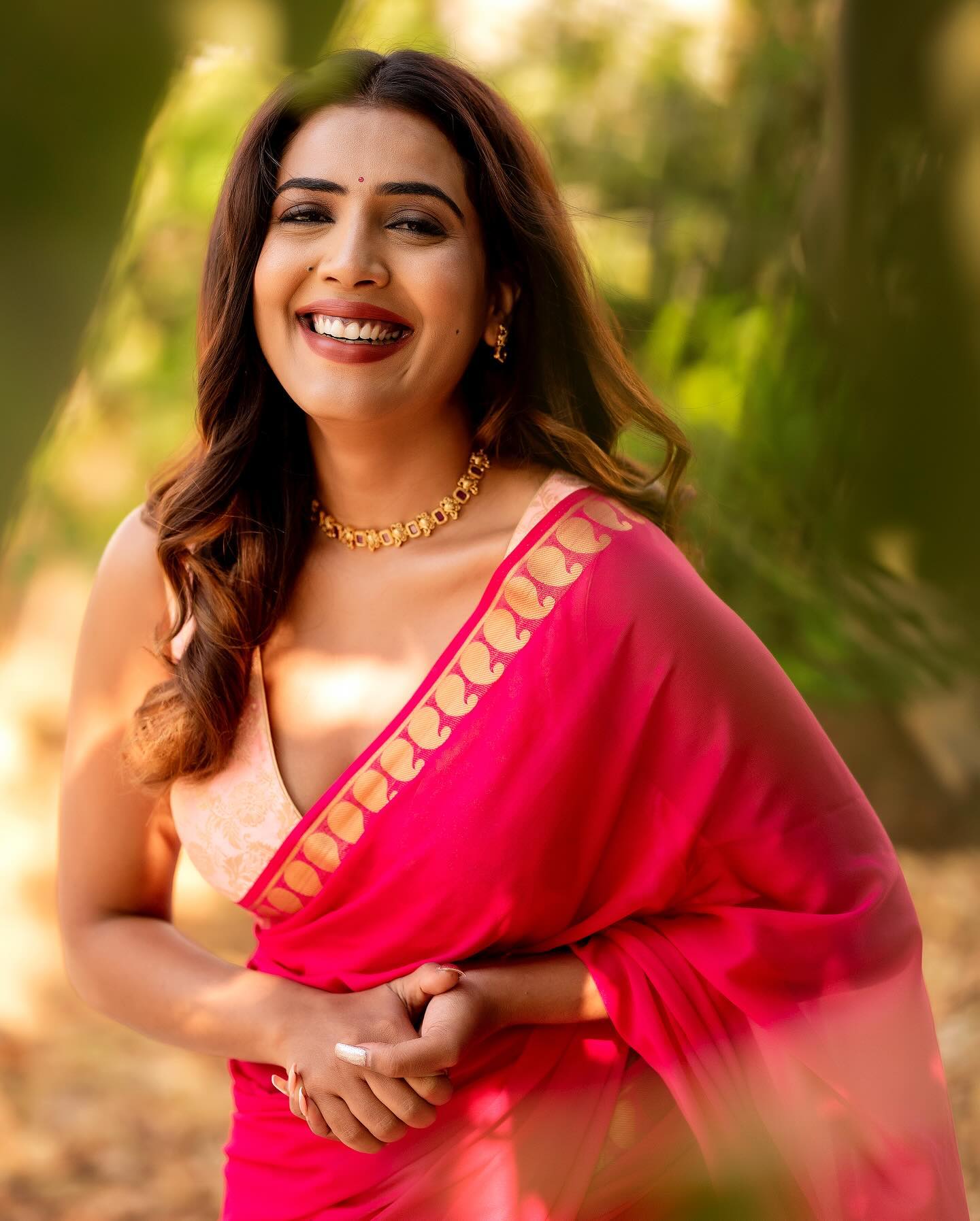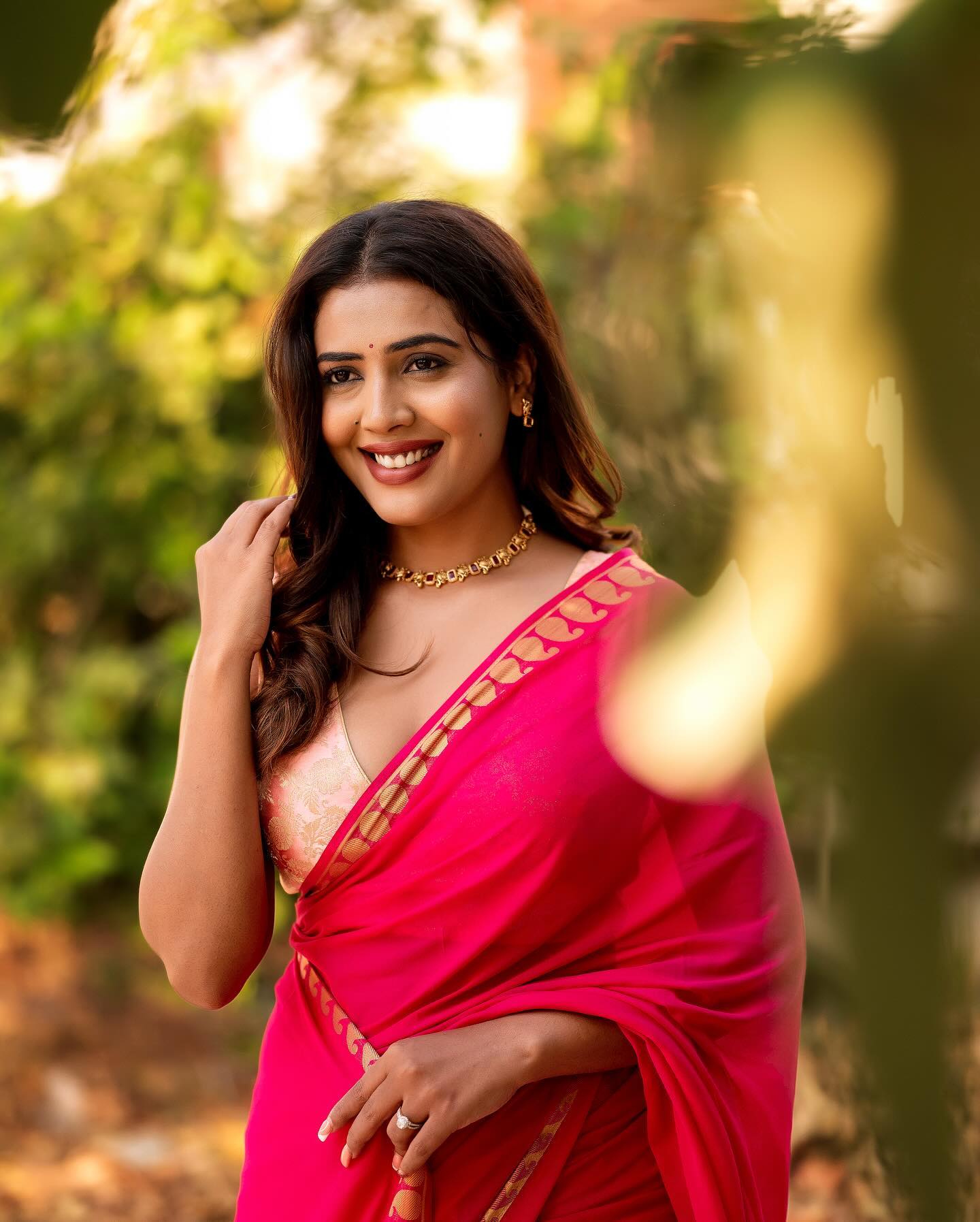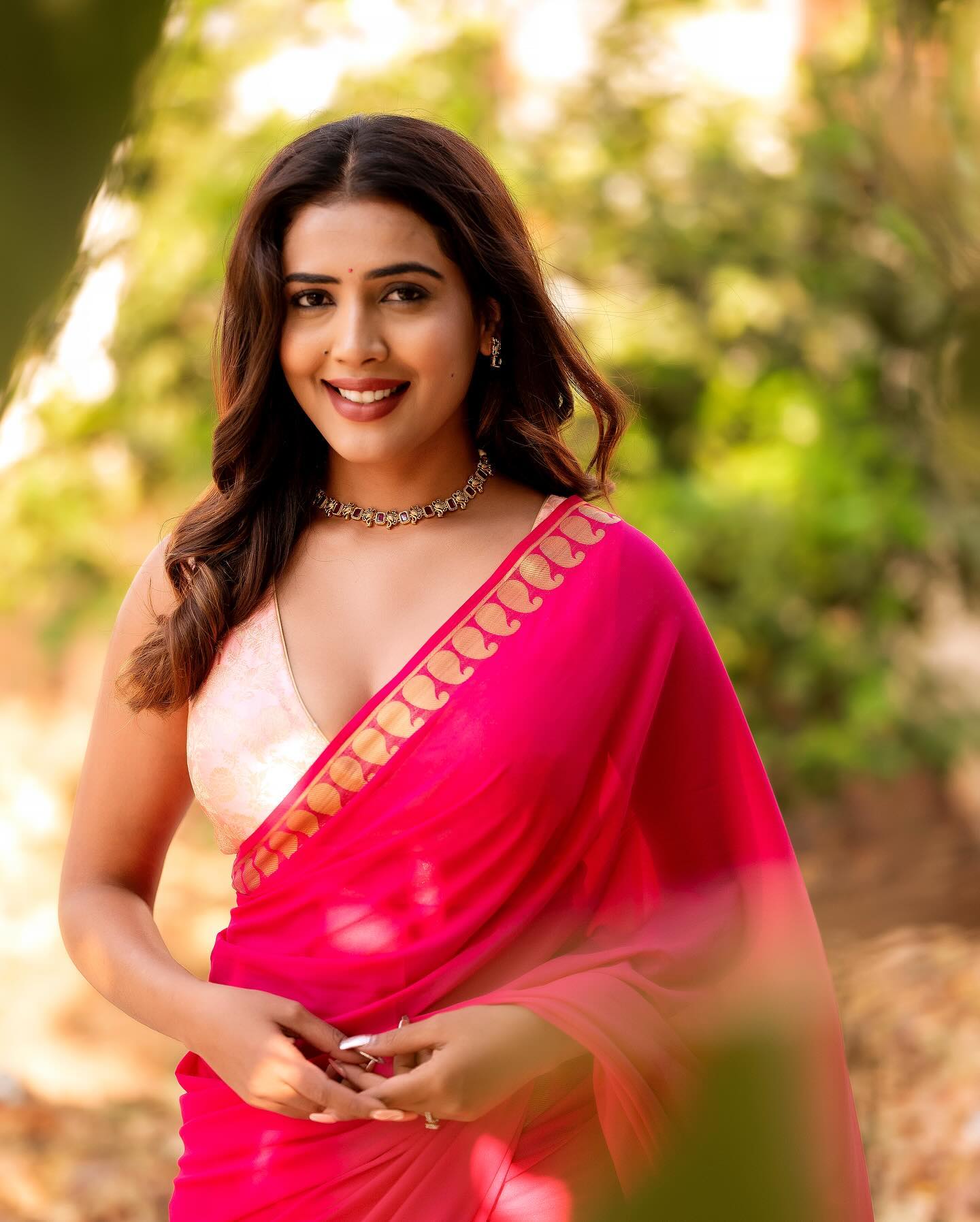 Sara Annaiah uses social media quite a bit, and she frequently posts photos of herself with her followers. The actress is seen in a stunning pink saree in her most recent instagram photo. sara is posing naturally for the camera while wearing an incredibly intricately woven saree with a golden border. She accessorised the saree with a sophisticated golden blouse with cut sleeves.