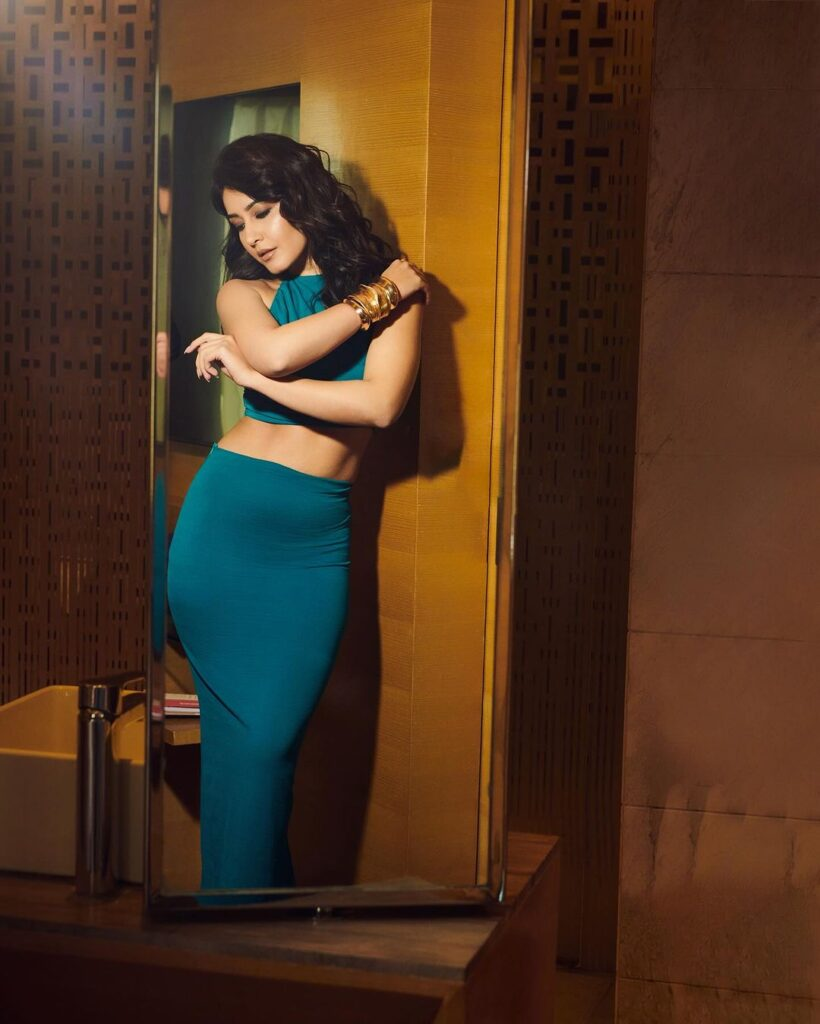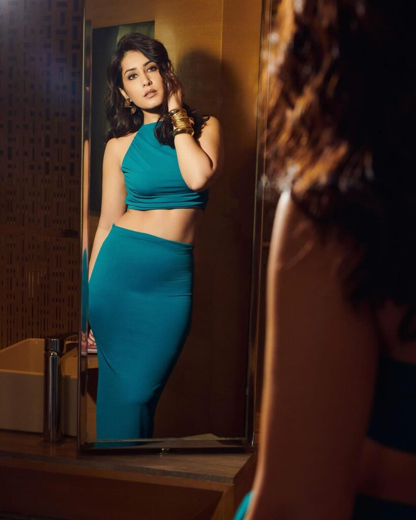 Instead of the typical red carpet dresses, she chose a stylish two-piece outfit in a vibrant shade of blue. Her commitment to fitness was evident in the sleeveless shirt, which accentuated her toned body. Raashi created confident postures, playfully engaging with a mirror and exhibiting classic grace in solo shots. The matching skirt gave a sense of elegance. Her thick, wavy hair elegantly framed her face, and golden bangles and earrings added the ideal finishing touches.