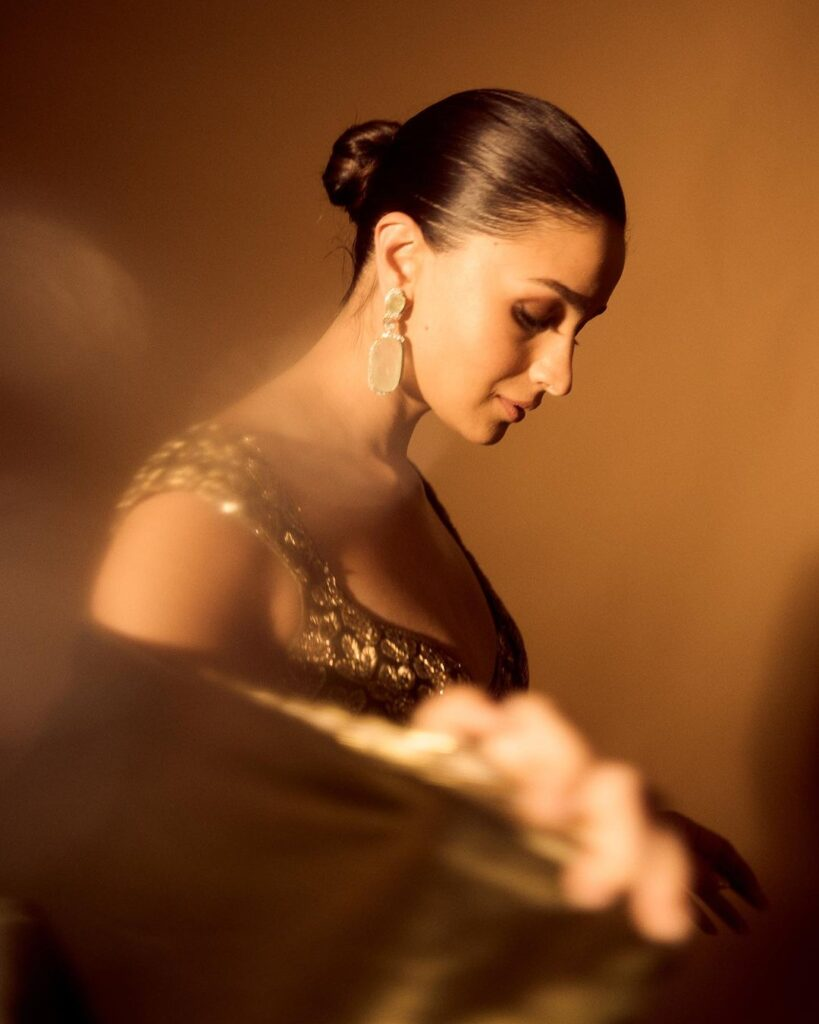 Alia Bhatt draped her velvet pallu across her back in a rich olive green classic. Her blouse's daring plunging neckline and intricate scalloped edges contributed to the conversation about risqué necklines in fashion, as seen on celebrities like Emily Ratajkowski during paris fashion Week. The antique gold embroidery on the blouse's capped sleeves was complemented by Russian emerald earrings from Malhotra's collection, which completed her ensemble.